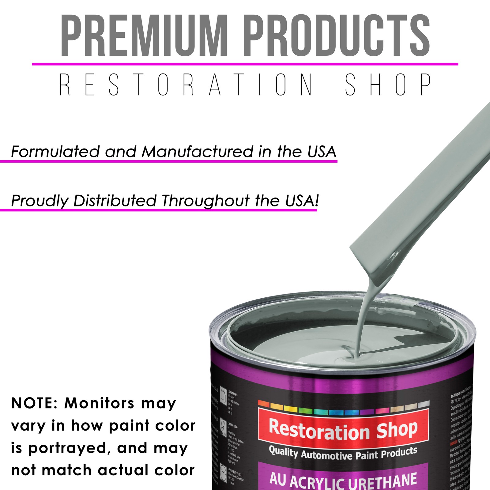 TCP Global Ebay Storefront Ordering | Shipping | Returns | International Product Information Part# RSP AU1113-KIT-Q Fleet White Acrylic Urethane Auto Paint (Complete Quart Paint Kit) Professional Single Stage Gloss Automotive Car Truck Coating, 4:1 Mix Ratio 2.8 VOC Complete 1 Quart Restoration Shop Acrylic Urethane Auto Paint Kit. The kit provides over 1 quart of sprayable material. AU has a 4 to 1 mix ratio and is 2.8 VOC when used as packaged, as no reducer is required (optional reducer sold separately). AU Paint Kit includes 1 Quart of AU Acrylic Urethane Paint Color, 1 Half-Pint of AU4001 Wet Look Urethane Hardener and a 3 Pack of 190 Micron Nylon Automotive Strainers. The Restoration Shop (AU) Acrylic Urethane System is a High-Performance Professional Easy-To-Use Single-Stage High Gloss Paint Coating System that is Designed for Overall Automotive Refinishing but is also used as a Fleet and Industrial Equipment Coating. AU is an easy to spray fast-drying topcoat system that provides a long-lasting and very high gloss finish result. AU is a very durable, chemical and solvent resistant coating that also resists chipping, cracking, and UV ray fading. Restoration Shop Products are Made in the U.S.A., and we formulate, manufacture, and distribute our products throughout the USA, unlike many competitors. Our superior coating products only use the highest quality ingredients, which allows our customers to achieve consistent, high-quality professional results on all their painting projects! Note: Monitors vary - onscreen colors are for general color reference only. This Restoration Shop (AU) ACRYLIC URETHANE QUART PAINT KIT Includes: 1 - Quart of High-Performance Restoration Shop Acrylic Urethane Auto Paint Color 1 - Half-Pint of Wet Look Urethane Hardener (RSP AU4001-QT) 3 - Each Premium 190 Micron Nylon Automotive Strainers AU has a 4 to 1 mixing ratio, 4 parts AU Paint Color to 1 part AU4001 Wet Look Urethane Hardener. AU is 2.8 VOC when used as packaged, as no reducer is required (optional reducer sold separately). The optional additional reducer may be added at a rate of up to 1 quart per gallon if desired. Use XR Series Exempt Reducers to maintain a 2.8 VOC Level or use the UR Series Urethane Reducers for a 3.5 VOC Level. Optional Reducers Available Separately XR Series Exempt Reducers to Maintain a 2.8 VOC Level: XR60 Exempt Fast Reducer 60-70¡ F; XR70 Exempt Medium Reducer 70-85¡ F; XR85 Exempt Slow Reducer 85¡ F and above UR Series Urethane Reducers for a 3.5 VOC Level: UR60 Fast Reducer 60-70¡ F; UR70 Medium Reducer 70-85¡ F; UR85 Slow Reducer 85¡ F and above Restoration Shop (AU) Acrylic Urethane Paint System AU is a High-Performance Professional Easy-To-Use Single-Stage High Gloss Paint Coating System that is Designed for Overall Automotive Refinishing but is also used as a Fleet and Industrial Equipment Coating. AU is an easy to spray fast-drying topcoat system that provides a long-lasting and very high gloss finish result. AU is a very durable, chemical and solvent resistant coating that also resists chipping, cracking, and UV ray fading. Note: Monitors May Vary in How Paint Color is Portrayed, and May Not Match Actual Color. All Restoration Shop stock paint colors are inspired and named after popular classic color names and are Not Made to Match O.E.M Paint Manufacturers Color Codes. Since 1974, Restoration Shop has been a Trusted Top Quality Brand and The Source for Innovative Premium Quality Automotive Products! Save up to 70% on products that meet or exceed the performance of the more expensive name brands! Our premium quality coating products are Made in the USA, and we formulate, manufacture, and distribute our products throughout the USA, unlike many competitors. Our superior coating products only use the highest quality ingredients, which allows our customers to achieve consistent, high-quality professional results on all their painting projects! With over 288 stock colors, and a custom Auto Color Library database going back into the early 1900s, there is no other place for your automotive paint needs. FLAMMABLE/HAZARDOUS ITEMS ARE SHIPPED VIA UPS GROUND/STANDARD TO THE LOWER 48 U.S. STATES & CANADA. ***SHIPPING VIA U.S. POSTAL SERVICE OR TO A P.O. BOX IS NOT AVAILABLE.*** RUSH AIR SHIPPING IS AVAILABLE IN CONTINENTAL U.S. FOR AN ADDITIONAL HAZMAT AIR SHIPPING CHARGE. CONTACT US PRIOR TO ORDERING FOR AIR SHIPPING QUOTE. IF ORDER IS PLACE FOR AIR SHIPPING YOU WILL BE CONTACTED FOR ADDITIONAL SHIPPING PAYMENT. INTERNATIONAL SHIPPING IS AVAILABLE. CONTACT US FOR SHIPPING QUOTE PRIOR TO ORDERING. View all categories Warehouse Locations San Diego, California South Carolina