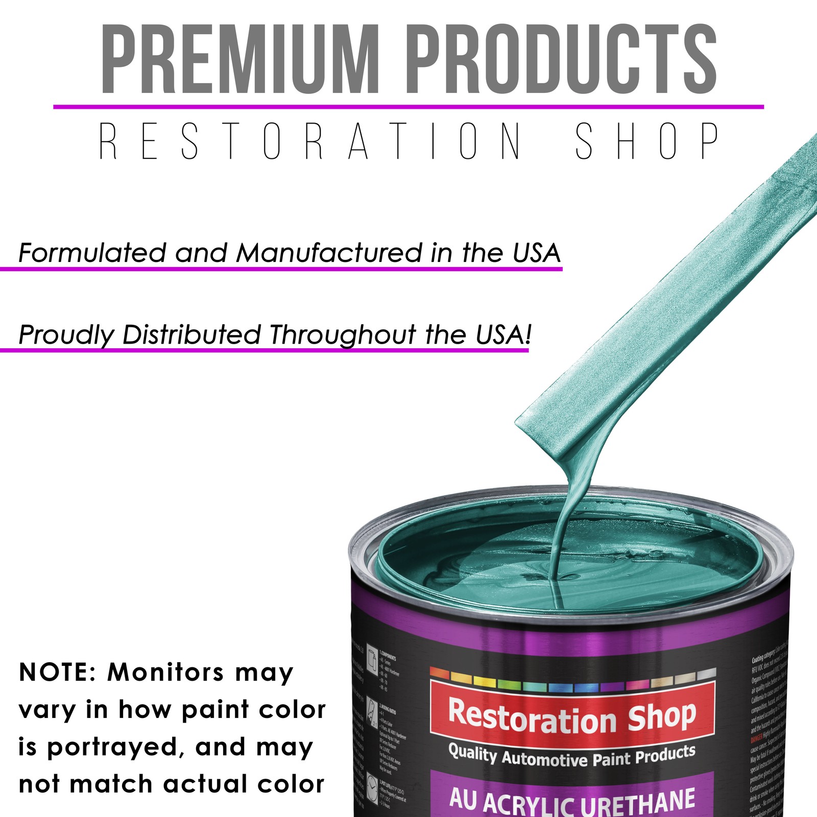 TCP Global Ebay Storefront Ordering | Shipping | Returns | International Product Information Part# RSP AU2603-KIT-M Gulfstream Aqua Metallic Acrylic Urethane Auto Paint - Complete Gallon Paint Kit - Pro Single Stage Automotive Car Truck Coating 4:1 Mix Ratio 2.8 VOC Complete 1 Gallon Restoration Shop Acrylic Urethane Auto Paint Kit. The kit provides 5 quarts (1 gallon + 1 quart) of sprayable material. AU has a 4 to 1 mix ratio and is 2.8 VOC when used as packaged, as no reducer is required (optional reducer sold separately). AU Paint Kit includes 1 Gallon of AU Acrylic Urethane Paint Color, 1 Quart of AU4001 Wet Look Urethane Hardener, 5 Pack of 190 Micron Nylon Automotive Strainers and a 5 Pack of Wood Paint Mixing Sticks. The Restoration Shop (AU) Acrylic Urethane System is a High-Performance Professional Easy-To-Use Single-Stage High Gloss Paint Coating System that is Designed for Overall Automotive Refinishing but is also used as a Fleet and Industrial Equipment Coating. AU is an easy to spray fast-drying topcoat system that provides a long-lasting and very high gloss finish result. AU is a very durable, chemical and solvent resistant coating that also resists chipping, cracking, and UV ray fading. Restoration Shop Products are Made in the U.S.A., and we formulate, manufacture, and distribute our products throughout the USA, unlike many competitors. Our superior coating products only use the highest quality ingredients, which allows our customers to achieve consistent, high-quality professional results on all their painting projects! Note: Monitors vary - onscreen colors are for general color reference only. This Restoration Shop (AU) ACRYLIC URETHANE GALLON PAINT KIT Includes: 1 - Gallon of High-Performance Restoration Shop Acrylic Urethane Auto Paint Color 1 - Quart of Wet Look Urethane Hardener (RSP AU4001-QT) 5 - Each Premium 190 Micron Nylon Automotive Strainers 5 - Each Wood Paint Mixing Sticks AU has a 4 to 1 mixing ratio, 4 parts AU Paint Color to 1 part AU4001 Wet Look Urethane Hardener. AU is 2.8 VOC when used as packaged, as no reducer is required (optional reducer sold separately). The optional additional reducer may be added at a rate of up to 1 quart per gallon if desired. Use XR Series Exempt Reducers to maintain a 2.8 VOC Level or use the UR Series Urethane Reducers for a 3.5 VOC Level. Optional Reducers Available Separately XR Series Exempt Reducers to Maintain a 2.8 VOC Level: XR60 Exempt Fast Reducer 60-70¡ F; XR70 Exempt Medium Reducer 70-85¡ F; XR85 Exempt Slow Reducer 85¡ F and above UR Series Urethane Reducers for a 3.5 VOC Level: UR60 Fast Reducer 60-70¡ F; UR70 Medium Reducer 70-85¡ F; UR85 Slow Reducer 85¡ F and above Restoration Shop (AU) Acrylic Urethane Paint System AU is a High-Performance Professional Easy-To-Use Single-Stage High Gloss Paint Coating System that is Designed for Overall Automotive Refinishing but is also used as a Fleet and Industrial Equipment Coating. AU is an easy to spray fast-drying topcoat system that provides a long-lasting and very high gloss finish result. AU is a very durable, chemical and solvent resistant coating that also resists chipping, cracking, and UV ray fading. Note: Monitors May Vary in How Paint Color is Portrayed, and May Not Match Actual Color. All Restoration Shop stock paint colors are inspired and named after popular classic color names and are Not Made to Match O.E.M Paint Manufacturers Color Codes. Since 1974, Restoration Shop has been a Trusted Top Quality Brand and The Source for Innovative Premium Quality Automotive Products! Save up to 70% on products that meet or exceed the performance of the more expensive name brands! Our premium quality coating products are Made in the USA, and we formulate, manufacture, and distribute our products throughout the USA, unlike many competitors. Our superior coating products only use the highest quality ingredients, which allows our customers to achieve consistent, high-quality professional results on all their painting projects! With over 288 stock colors, and a custom Auto Color Library database going back into the early 1900s, there is no other place for your automotive paint needs. FLAMMABLE/HAZARDOUS ITEMS ARE SHIPPED VIA UPS GROUND/STANDARD TO THE LOWER 48 U.S. STATES & CANADA. ***SHIPPING VIA U.S. POSTAL SERVICE OR TO A P.O. BOX IS NOT AVAILABLE.*** RUSH AIR SHIPPING IS AVAILABLE IN CONTINENTAL U.S. FOR AN ADDITIONAL HAZMAT AIR SHIPPING CHARGE. CONTACT US PRIOR TO ORDERING FOR AIR SHIPPING QUOTE. IF ORDER IS PLACE FOR AIR SHIPPING YOU WILL BE CONTACTED FOR ADDITIONAL SHIPPING PAYMENT. INTERNATIONAL SHIPPING IS AVAILABLE. CONTACT US FOR SHIPPING QUOTE PRIOR TO ORDERING. View all categories Warehouse Locations San Diego, California South Carolina