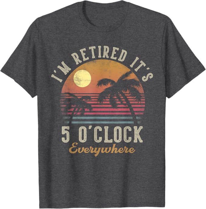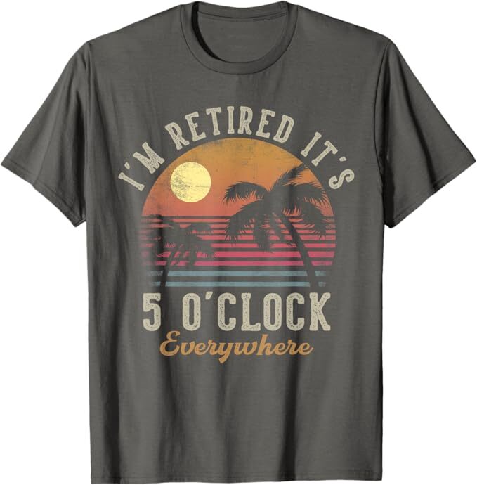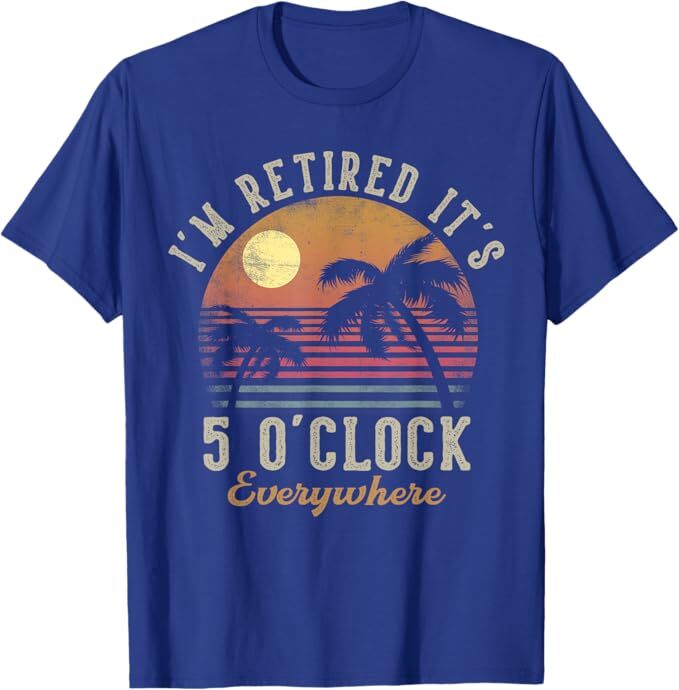 I'm Retired It's 5 O'Clock Everywhere Funny Retirement T-Shirt Designed and Printed in USA Product Features: • Classic Look and Feel: This ultra cotton tee offer the timeless appeal of traditional cotton. The high-quality print enhances its casual appearance. • Material: Made from 6.1-ounce, 100% cotton. (Note: Dark Heather variant is 50% cotton, 50% polyester.) • Durability: Features double-needle stitching on the neck, sleeves, and hem for added durability. Designed for a roomy, unisex fit. • Print Type: DTG (Direct to Garment) • Manufacturer: Gildan 5000, 5000b (Made in USA) Shipping Information: • Handling Time: With POD(Print-On-Demand) product model, we typically require about 3 business-days handling time before shipping. In most cases, our handling time’s , rang e from 1-2 business days. • Delivery Time: • USA: Approximately 2 -6 business days • Canada: Approximately 6-10 business days (We currently don’t offer international Shipping) • Worldwide: Approximately 15-25 business days (We Currently don’t offer international Shipping) • Shipping Carriers: USPS and DHL • Note: Business days exclude weekends and holidays. Return & Exchange Policy: • Quality Guarantee: We stand behind the quality of our products and workmanship . Any defects or errors on our part must result in a refund/ replacement at no charge. • Conditions for Returns: Returns are generally not accepted for user errors such as incorrect selection of sizes, designs, or colors. Returns /Replacements are acceptable for damages such as poor printing results, incorrect size or design caused by us. • Note: Please reach out to us if there are any questions or issue s with your item, we’ll do our best to resolve any issue you might have. Note: • We’re glad to have your support! If you have a moment, y our honest feedback is very valuable to us. Thank you!