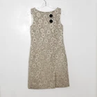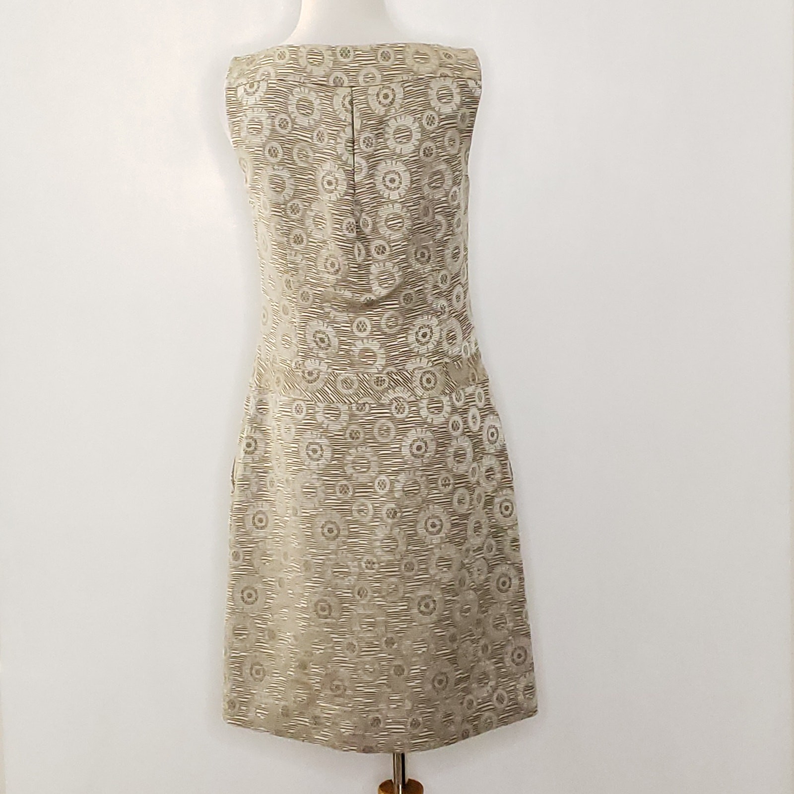 Classiques Entier dress Size XS extra small Shell: 58% acetate/35% cotton/6% linen Lining: 100% polyester A-line silhouette Bateau neckline Sleeveless Neutral colors- brown with cream and silvery gray jacquard circle print Retro 60s look Decorative buttons at neckline Pockets Concealed side zip Fully lined Approx. lay-flat measurements: Length: ~37.5" Pit to pit: ~16.5" Waist: ~16" Excellent pre-owned condition. No notable flaws/signs of wear