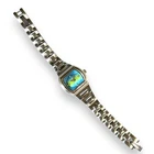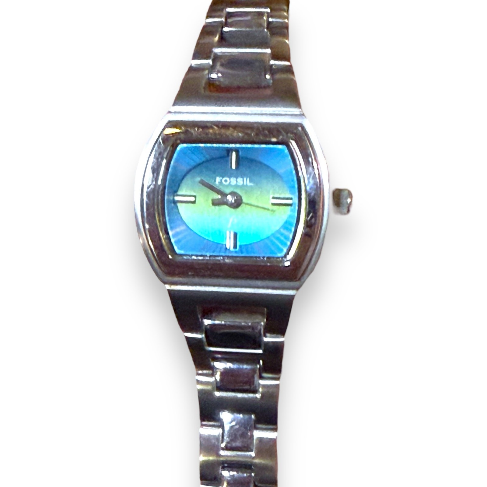 Retro Fossil F2 Watch Womens Stainless Steel Quartz Blue Yellow Dial WORKS Elevate your classic style game with this Retro Fossil F2 Watch. This stunning timepiece features a stainless steel construction, quartz movement, and a unique blue and yellow iridescent dial. With its top-notch functionality and modern design, this watch is a must-have for any fashion-forward woman. The watch is in good working condition and ready to wear. There is some light scratching on the bezel and bracelet.