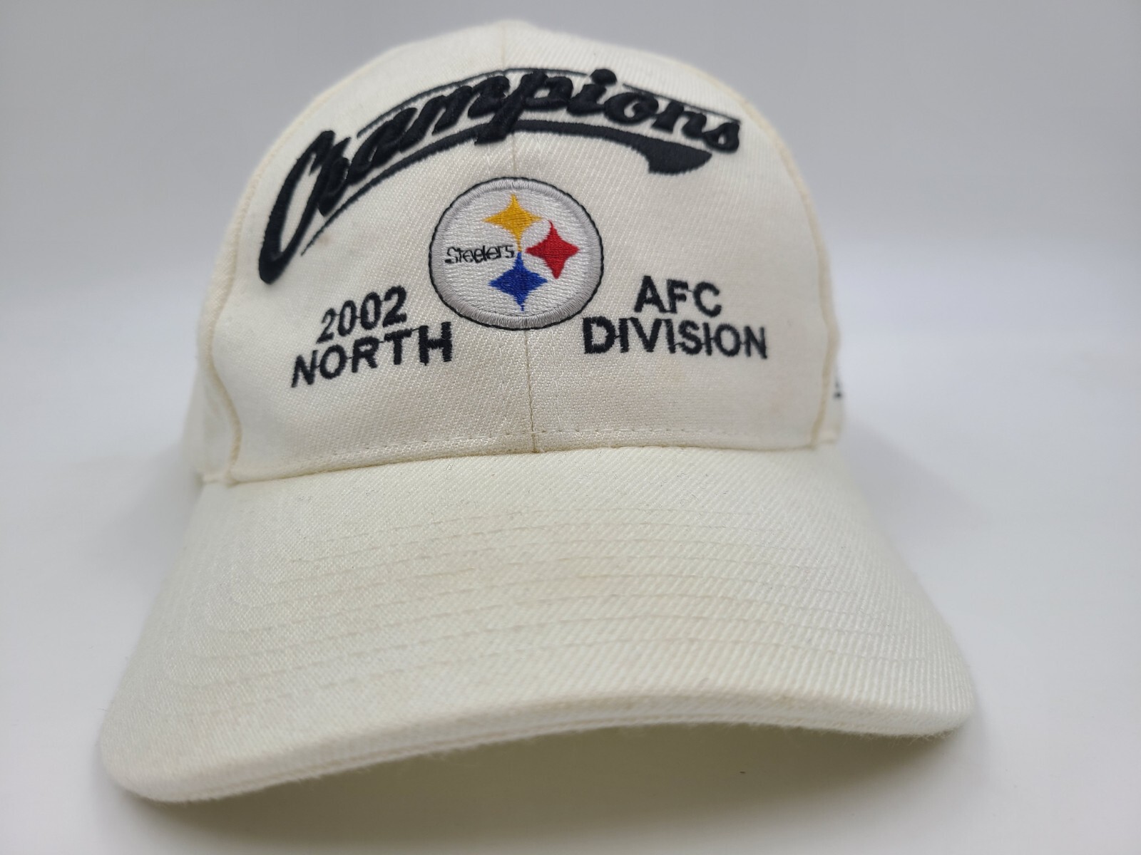 Has stains/scuffs/discoloration all around the hat as seen in photos. Vintage Pittsburgh Steelers 2002 AFC North Division Champions Adjustable Hat Cap. EACH ADDITIONAL HAT PURCHASED IS ONLY $1 ADDED SHIPPING!