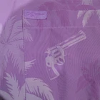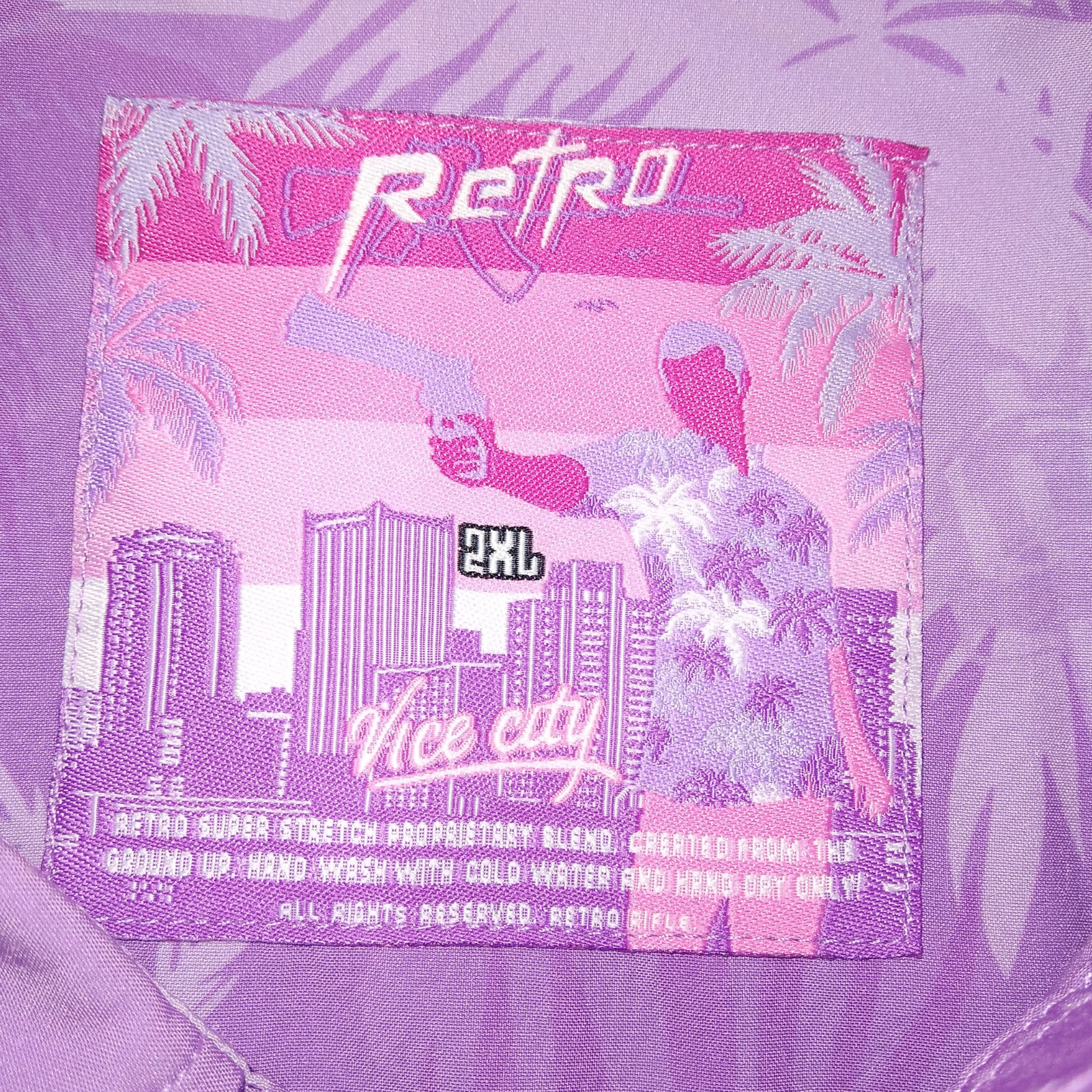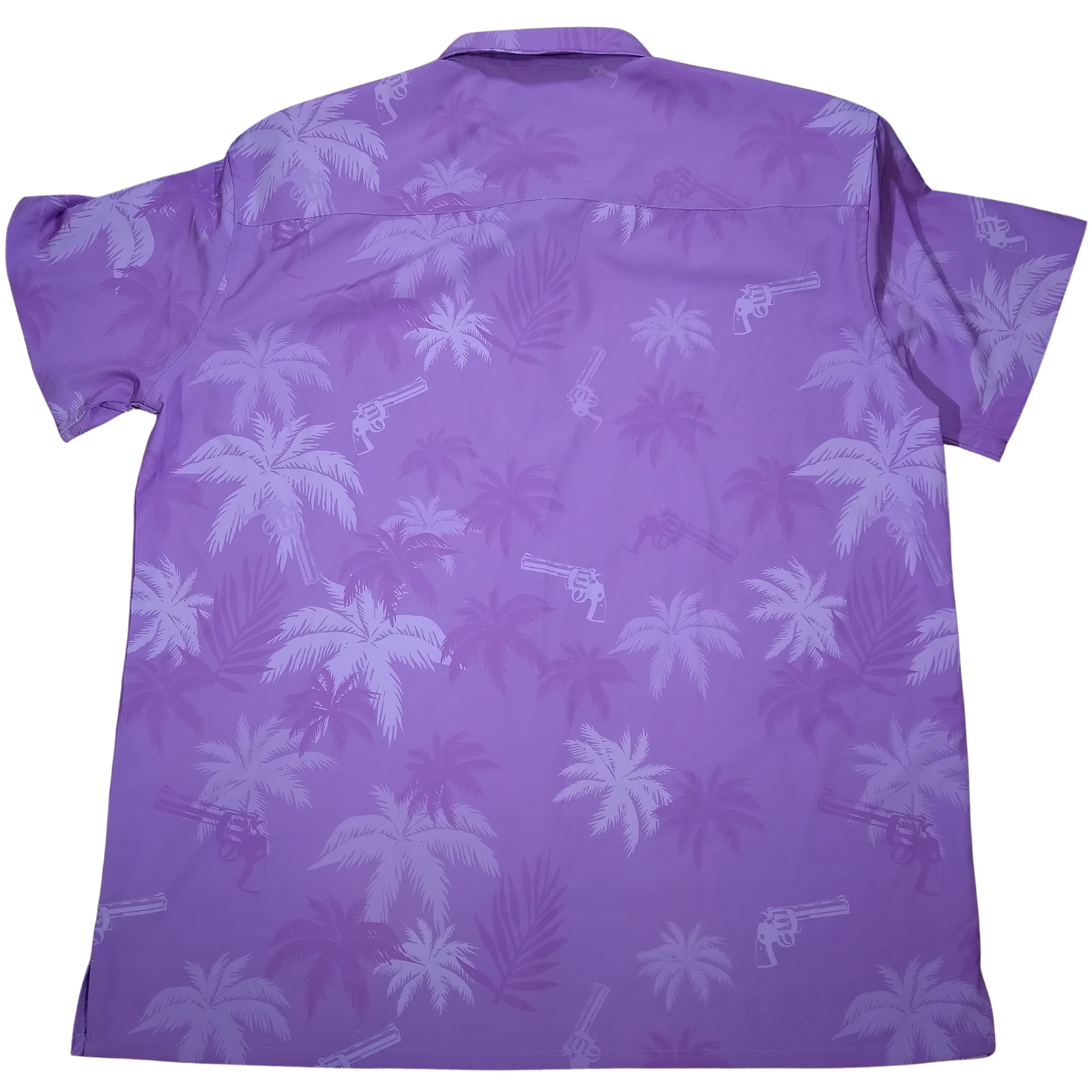 Retro Rifle Vice City Purple Palm Revolver Button Down Shirt in size 2XL is a stylish and retro-inspired piece perfect for casual occasions. Made of polyester spandex blend woven fabric, this shirt features a collared neckline, short sleeves, and button closure. The purple color and button accents add a pop of color and a touch of retro nostalgia to the design. This regular fit shirt by Retro Rifle is a great addition to any man's wardrobe, offering a comfortable and unique style with a retro theme.