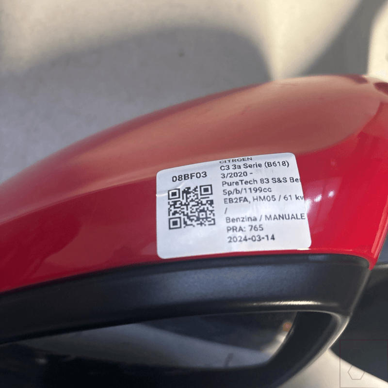 Retrovisore est. regolaz. elettr. Autodemolizioni Signor si digitalizza con LekoTech. Spedizione rapida dell'ordine (1-2 giorni lavorativi) Realizzato da LekoTech Links Esplora il nostro negozio Salva tra i preferiti Recensioni dei clienti Retrovisore est. regolaz. elettr. Descrizione Si prega di controllare il numero di parte prima di acquistare. Riceverai l'articolo mostrato nelle immagini! Si prega di leggere le specifiche e i codici dell'articolo, scorrere tutte le immagini disponibili e confrontarlo con la parte che si sta sostituendo. L'articolo raffigurato è quello che riceverai così com'è e non includerà altre parti o pezzi.. NOTA BENE: Molti veicoli utilizzano parti dall'aspetto simile, ma con più opzioni. Si prega di verificare che si adatti e sia compatibile con il modello specifico prima dell'acquisto. Il montaggio è responsabilità dell'acquirente. NOTE DEL VENDITORE: specchietto retrovisore sx NOTA: La fattura deve essere richiesta nel campo note per il venditore contestualmente all’acquisto, diversamente non potremo evadere la richiesta Specificazione Specificazione 98267134XT Posizioni parziali Sinistra Modello auto / Carrozzeria CITROEN C3 3a Serie (B618) Anni di auto 2022-07-31 - Motore 81 kw, Petrol Codice motore EB2ADT, HN05 Gruppo Lamierati esterni Numero di porte 5 Codice QR 08bf03 Colore esterno auto NERO Tabella dei tempi di consegna dopo il pagamento Italia 1-2 giorni lavorativi * Germania 2-7 giorni lavorativi * Francia 2-7 giorni lavorativi * Spagna 2-7 giorni lavorativi * >Tutti i paesi dell'UE *I tempi di consegna indicati si riferiscono solo alla terraferma, con 1-2 giorni lavorativi per l'Italia; per le isole, la consegna potrebbe richiedere un giorno lavorativo in più. Cosa sono i ricambi auto ecologici? I pezzi di ricambio riciclati per auto, noti anche come green parts, sono componenti OEM originali recuperati da veicoli rottamati. LekoTech consente ai autodemolitori di trasformare i loro processi di vendita di pezzi per soddisfare la crescente domanda di green parts. Perché scegliere ricambi auto ecologici? Costo, beneficio ambientale, alta qualità, disponibilità. Politica sui resi Informazioni sulla spedizione Opzioni di pagamento Informazioni importanti In caso di malfunzionamento del ricambio garantiamo la sostituzione con uno equivalente, se disponibile, o il rimborso di quanto corrisposto in sede di acquisto. Non sono inclusi gli eventuali costi relativi al montaggio del ricambio. Per poter accedere alla sostituzione gratuita o al rimborso il ricambio difettoso DEVE essere restituito integro e comprensivo di tutte le sue parti, nelle medesime condizioni d’uso di fornitura iniziale. Restituzione: entro 30 giorni. L'acquirente paga le spese di spedizione per la restituzione dell'oggetto Il Vostro ordine viene evaso nei due giorni lavorativi successivi al pagamento. La maggior parte delle spedizioni viene effettuata entro il giorno successivo al pagamento. Avvenuta la presa in carico dal corriere espresso della merce, la consegna avverrà in 24/48h a seconda della destinazione, salvo zone particolarmente disagiate. Riceverete dettagliate informazioni sullo stato della spedizione direttamente dal corriere via mail o sms. La condizione “spedizione inclusa” non comprende le isole e le zone disagiate. Per tali spedizioni, prima di effettuare l’ordine, contattateci per messaggio così da ricevere un preventivo di spedizione corretto. Accettiamo solo metodi di pagamento supportati da eBay. Tutti i pagamenti devono essere ricevuti prima che l'articolo venga spedito. Se hai acquistato un articolo e non puoi procedere con il pagamento, faccelo sapere. Motori Se non diversamente indicato i motori vengono venduti sprovvisti di organi secondari quali alternatore, compressore a/c, motorino avviamento e frizione. Il cambio e' considerato escluso sempre dalla vendita, anche se presente parzialmente in foto. Elettronica Ricambi appartenenti all'elettronica del veicolo potrebbero necessitare di ricodifica (anche a pagamento) presso tecnici specializzati a vs. carico. non disponiamo di codici autoradio o car pass, ma e' possibile fornire il telaio (vin) dell'auto di provenienza Carrozzeria Trattandosi di ricambi usati, e' sempre possibile trovare segni di usura e graffi oltre quelli evidenziati in foto Attenzione La fattura deve essere richiesta nel campo note per il venditore contestualmente all’acquisto, diversamente non potremo evadere la richiesta. I ricambi venduti sono quelli delle foto. I codici riportati nell'annuncio non sono solo quelli impressi nel ricambio ma anche quelli compatibili secondo i programmi infocar e autodata per la vettura in questione, in base ai dati forniti dalle case costruttrici (cross-reference ed adattabilita'). Consigliamo comunque di controllare bene la corrispondenza del codice ricambio riportato nelle foto con quello di cui si necessita Politica sui resi Informazioni sulla spedizione Opzioni di pagamento Informazioni importanti In LekoTech, abbiamo digitalizzato oltre 350.000 pezzi di ricambio, dotando gli autodemolitori di un sistema fluido e basato sulla tecnologia per gestire e vendere i pezzi in modo efficiente. La nostra piattaforma trasforma le operazioni quotidiane, rendendo i pezzi di ricambio più accessibili e il flusso di lavoro più fluido che mai. Soluzione per ricambi auto ecologici. LekoTech © 2025 Tutti i diritti riservati