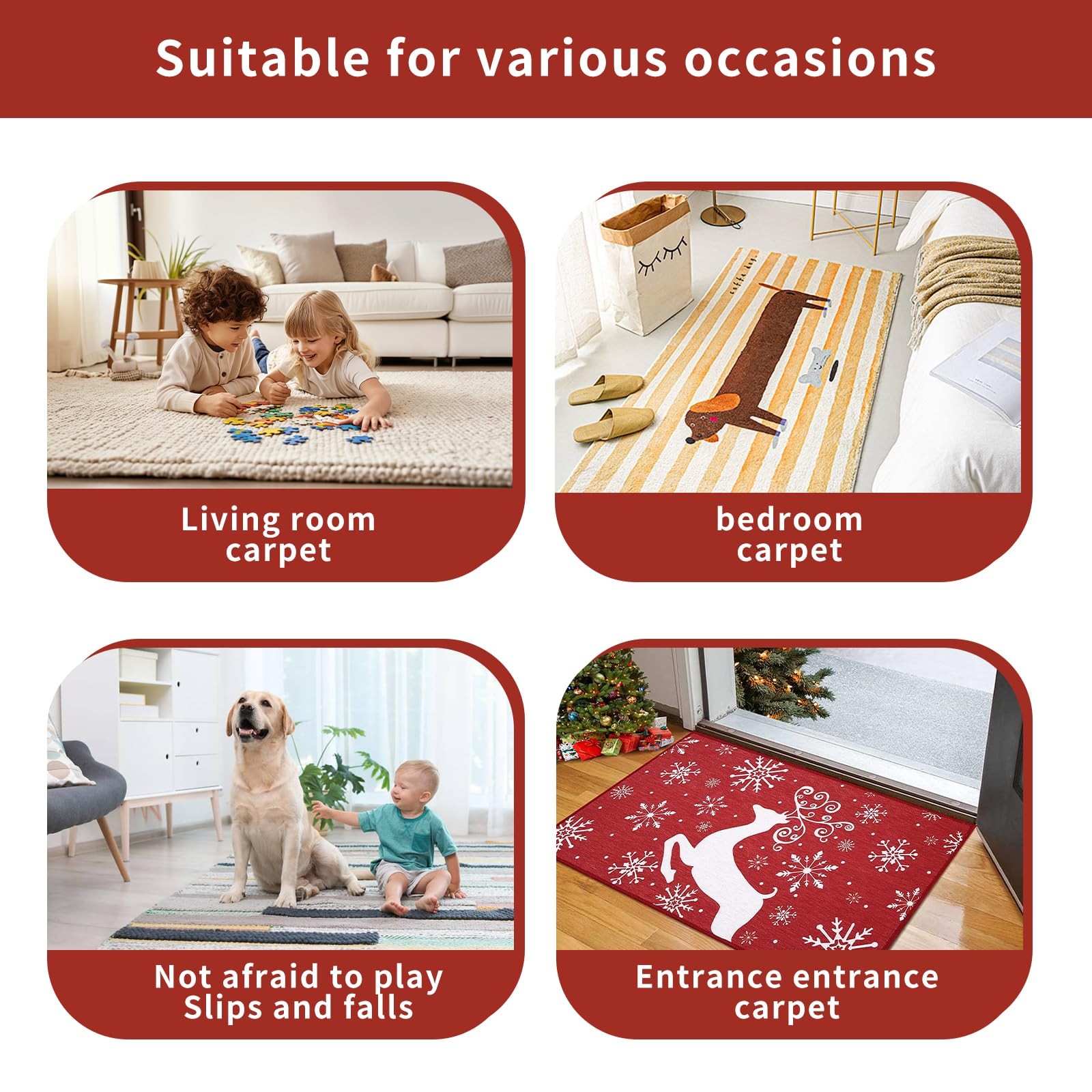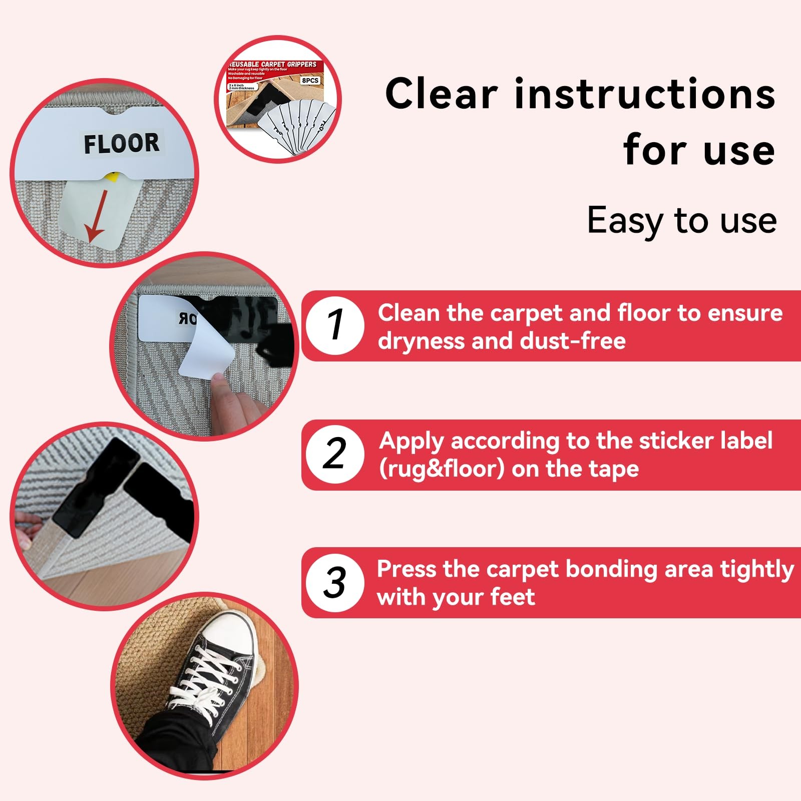 Rug Tape, Non Slip Rug Pads Grippers for Hardwood Floors and Tiles, Reusable Carpet Tape for Area Rugs, Double-Sided Adhesive Rug Stickers Keep Corners Flat Can be used in kitchen, bathroom, living room scenes, convenient to use Make your rug keep tightly on the floor: Fed up of rugs curling and sliding whilst you vacuum? Professional and beautiful carpet grippers design, with strong dual sided adhesive,Large size can firmly adhere to the carpet and floor, keeping the corners and edges of your carpet flat and no longer warped. Protect your family:Stop slips, trips, and falls, curled corners and sliding rugs are a danger to your family. Keep tour area rugs in place and secure with no slip rug pads. Washable and reusable: The grippers for rugs are easily removed and no residues will be left. You can wipe the grippers with clean water or soapy water if needed. Well, cleaning with rubbing alcohol could help achieve better effectiveness to resume the adhesion. Note: If the backing of your rugs has fluff or fiber, it is not suggested to remove the grippers from your area rugs to wash. Just clean or wash the grippers on the rug Easy to Use: just remove the release paper from the carpet slip grip and apply it to dry and dust free carpets and floors.When you need to clean the floor under the carpet, you can easily temporarily remove the product from floor and reapply it after cleaning, No Damaging for Floor: The floor side of non slip rug carpet tape is removable and without residue, and it will not damage or stain your flooring, especially wooden floor, laminate floor. NOTE: 1. It is not recommended to use on the area rug with FLUFF backing, as the grippers are very sticky and may remove the fluff. 2. It is not recommended to use on the area rug with JUTE or RUBBER backing, as the grippers may not stick to these materials. 3. It is not recommended to use on AREA RUG over CARPET 🏆 Instant Setup, Security ✨ 6-Second No-Tools Installation — Simply peel, stick, and secure your rug in seconds. No adhesives, no drilling, for all floors (wood, tile, laminate).