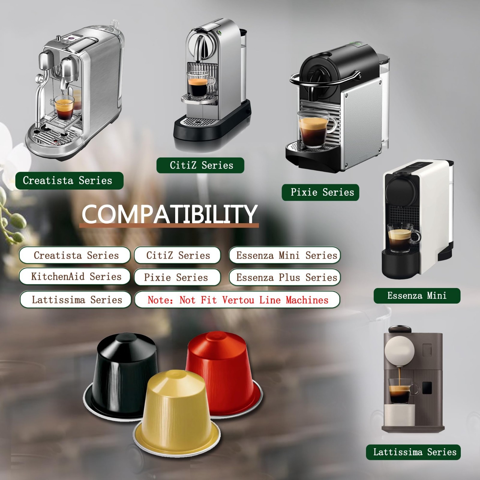 Reusable Nespresso Capsules for OriginalLine Machines - Save Money, Reduce Waste Take control of your coffee experience and enjoy endless brew options with this set of refillable coffee capsules. Designed to provide cost savings and environmental benefits, these pods allow you to use your favorite ground coffee, giving you superior flavor and variety compared to pre-filled capsules. Eco-Friendly & High-Performance Features Full Compatibility: Engineered to work perfectly with Nespresso OriginalLine machines (including Pixie, Essenza Mini, Citiz, Lattissima, etc.). **Not compatible with Vertuo machines.** Use Your Own Coffee: Fill the reusable pods with any gourmet ground coffee you prefer, allowing you to tailor the strength, flavor, and roast to your exact liking. Cost-Effective Solution: Significantly reduce your per-cup cost by eliminating the constant need to buy expensive, single-use factory capsules. Food-Grade Material: The pods are made from safe, durable, food-grade plastic, ensuring no harmful substances leach into your coffee. The set includes disposable foil lids for easy sealing. Simple to Use, Great Results The process is quick and simple: just fill the pod with your grind, seal with a foil lid, and brew. Enjoy great crema and a rich, satisfying shot every time. Benefits of Switching: Choose from Local Roasters and Specialty Grinds Significantly Lower Per-Cup Coffee Costs Reduces Plastic and Aluminum Waste from Disposable Pods Easy Clean-Up and Quick Refill Process Start enjoying personalized, sustainable, and cost-effective espresso today with this simple replacement capsule system!