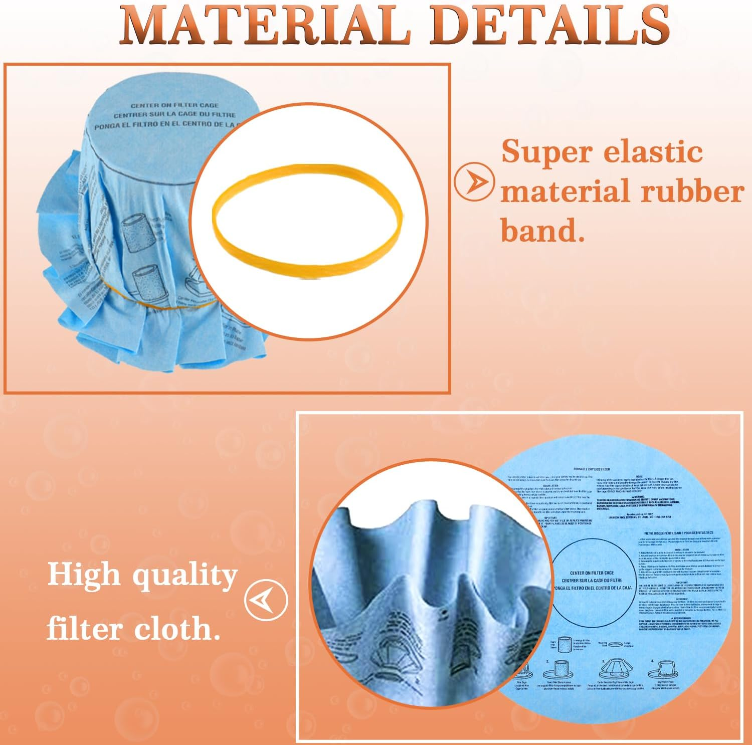 Great value:This package includes 6 wet dry vacuum bag filters,3 retaining band. A wet and dry dual purpose vacuum cleaner can effectively collect daily household waste such as dirt, dust, and sand. You can use it at home, office, school, and other places to quickly and easily remove dirt; Please note that the replaced dry filter is only used for dry debris collection. Made of high-quality and ultra Sustainable non-woven fabric, it can prevent blockages and improve airflow, thereby optimizing filtration and comprehensively preventing toxic dust in the air. Non woven materials are non hazardous, non-toxic, non flammable, and safe to use. Designed to fit: This VF2002 filter Compitiable with ShopVac, VacMaster, Genie wet/dry vacs wet dry vacuums 5 Gallon and above (except 5 Gallon portable model H87S, 5 Gallon HangUp, 5 Gallon Wall Mount and 6 Gallon long life model P12S Vacuums). Also fits for Shop-vac 203600 2.5 gallon vacuum. Compart to #9010700/9013700, Type S, Type T. Important: Please carefully check the model before ordering. If you are unsure of compatibility, please send us your vacuum cleaner model so that we can help you confirm if it is suitable. Product description