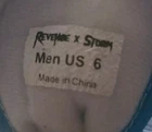 This is a pair of Revenge X Storm Vans sneakers in size 6 for men. The shoes feature a solid blue color with a lightning bolt design, lace-up closure, low top style, suede upper, and rubber outsole. They are designed for athletic activities, casual wear, and work, with a comfortable and cushioned construction. The sneakers are part of a limited edition collection designed by Ian Connor.