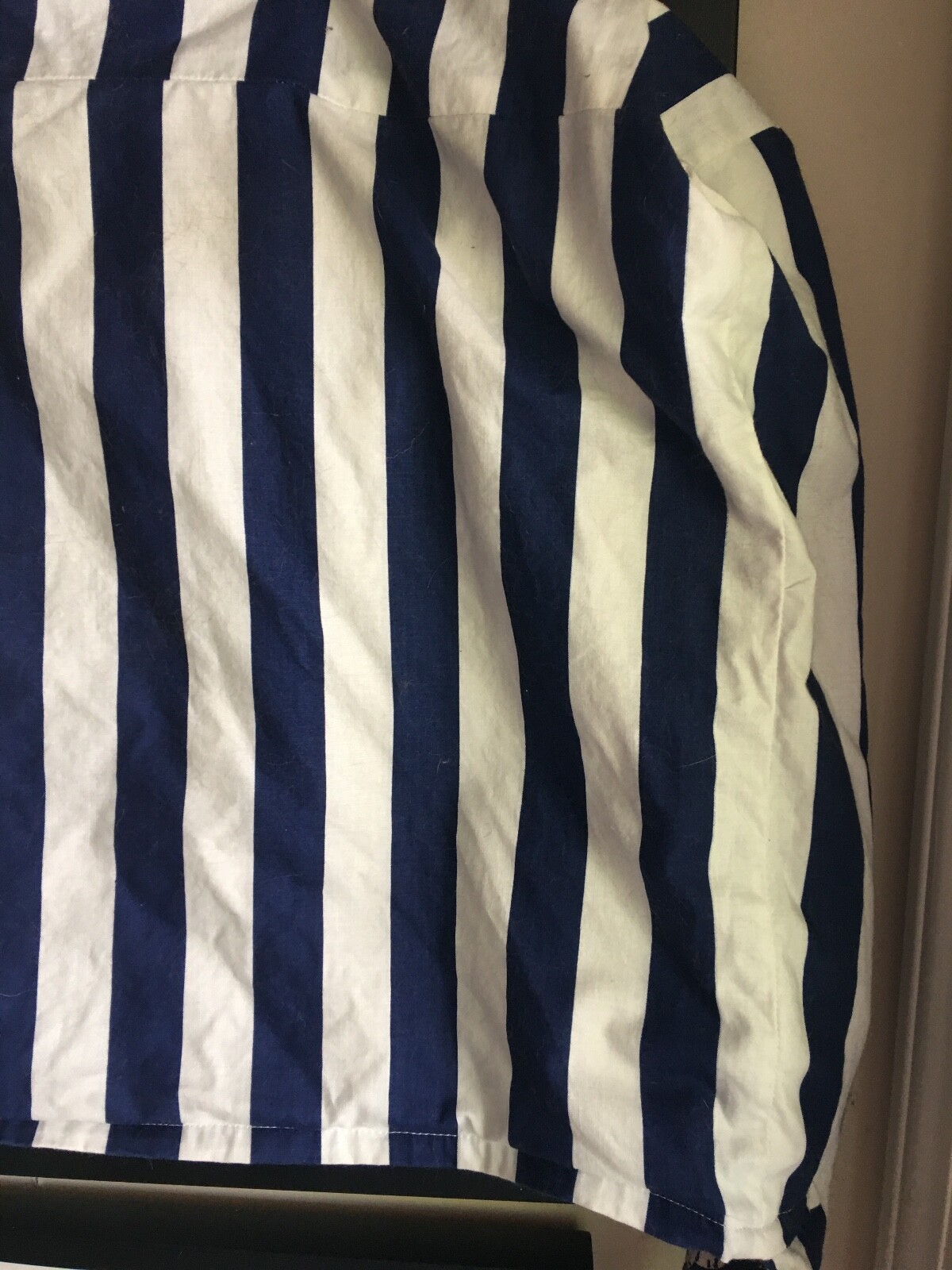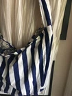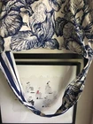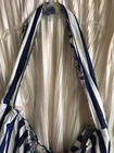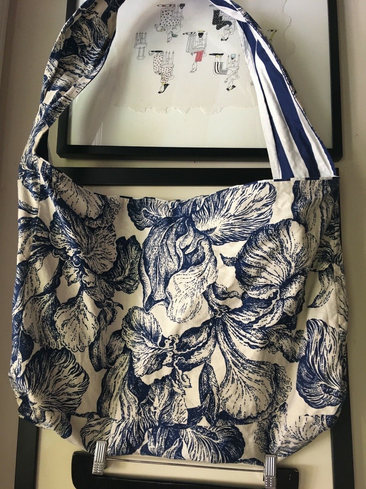 Extra large terrific reversible tote for travel, easy to pack, for the beach or a picnic or shopping. Blue and white stripes on one side and blue and white toile floral on the other. All tags were removed by my consignor. The floral side fabric seems like linen or a blend and the striped side seems like smooth good cotton. The strap measures 36 end to end and is wider toward the sides and more narrow in the center. Sits flat on your shoulder and the bag, being fabric drops in the center unless well filled. A few threads peaking out at a seam underneath as shown in the third from last picture. Otherwise fabulous and useful. No closure at the top.