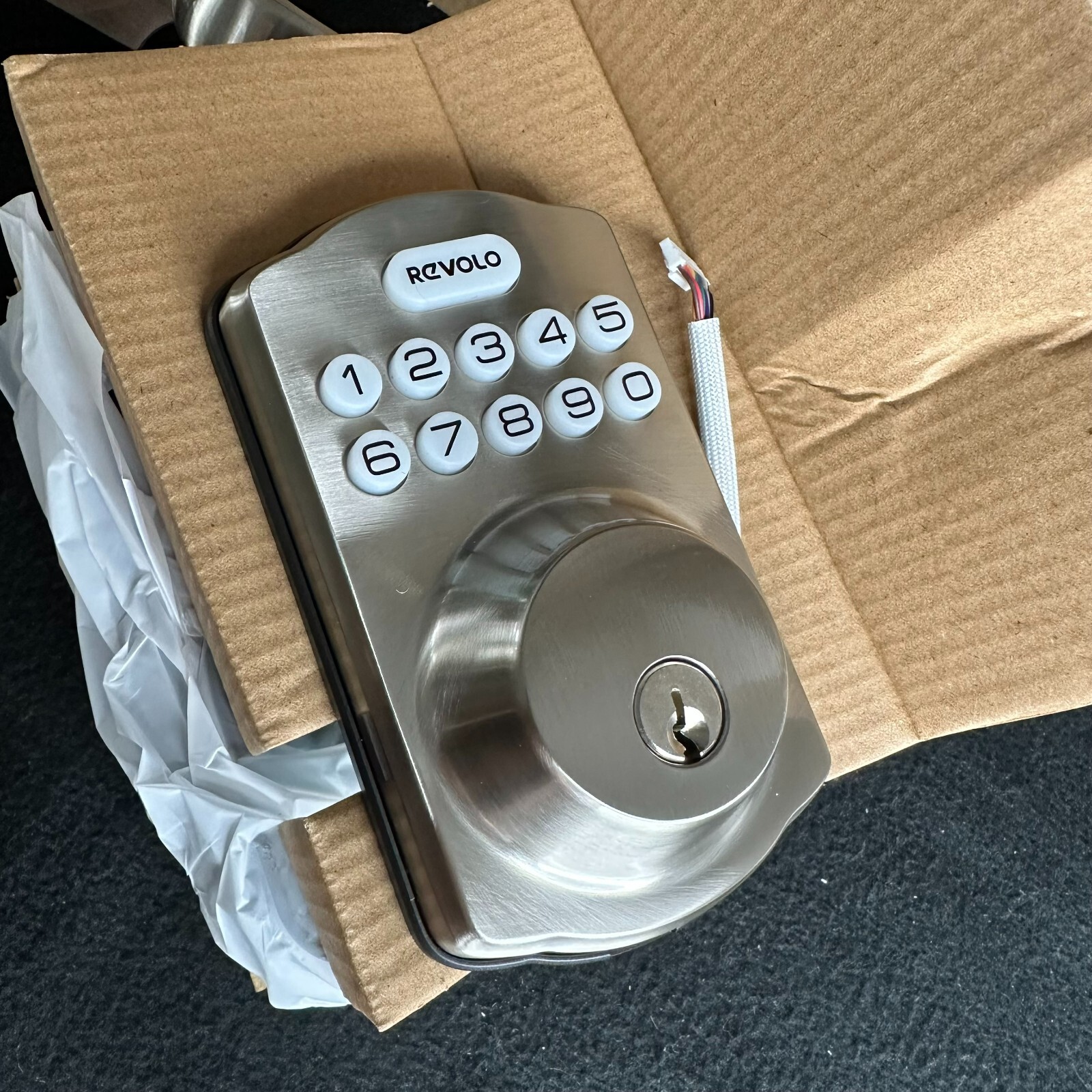 Revolo Electronic Keypad Deadbolt, Keyless Entry Door Lock, Keyed Entry, Auto Lock, Door Lock with Handle, Front Door Handle Sets, Anti-Peeking Password This was sent to me as a replacement when I received a lock with a broken part. It has never been installed or even removed from the box. Color-Satin Nickel Material-Stainless Steel, Zinc Finish Type-Satin Lock Type-Keypad Lock Item Weight-4 Pounds Control Method-Touch Controller Type-Passcode,Key Manufacturer-Revolo Item Weight-4 pounds Package Dimensions-18.3 x 7.2 x 3.6 inches Item model number Deadbolt Door Lock with Handle Finish-Satin Batteries Included? No