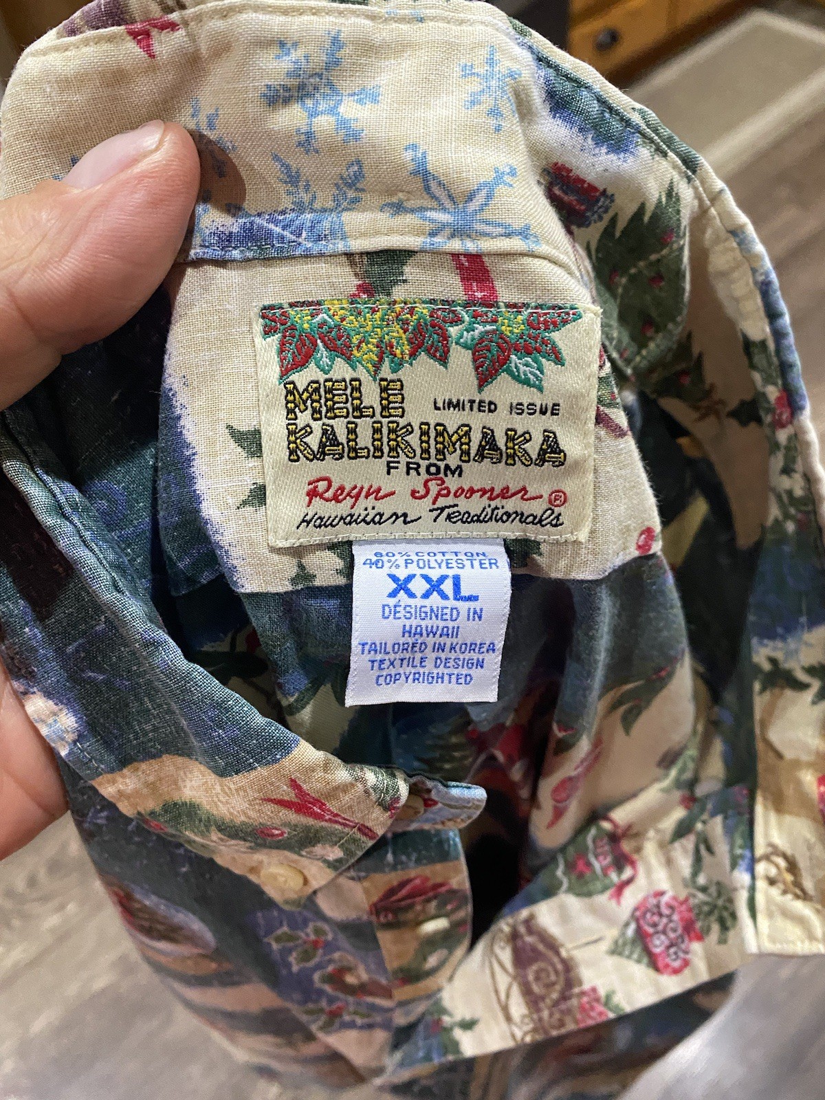 The Reyn Spooner 2010 Christmas shirt is a vintage button-up shirt featuring Santa Claus as the character. Made from a cotton blend material, this multicolor shirt has a collared neckline and short sleeves, with button accents and a button-down collar style. Suitable for casual occasions, this 2XL shirt is machine washable and perfect for men who enjoy festive holiday clothing. The shirt is part of the Reyn Spooner brand and embodies a Christmas theme, making it a unique and fun addition to any wardrobe.