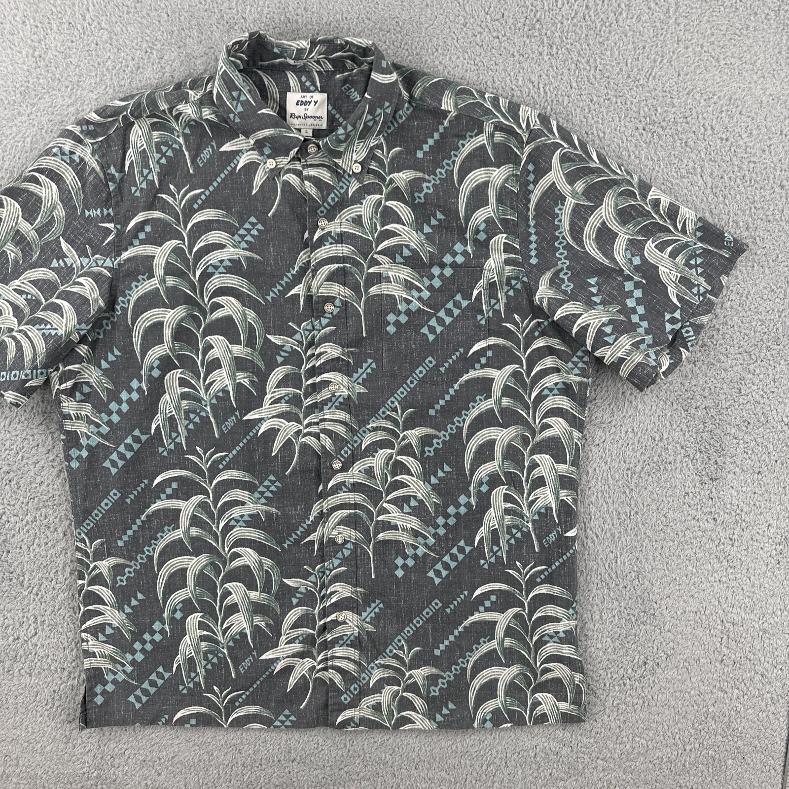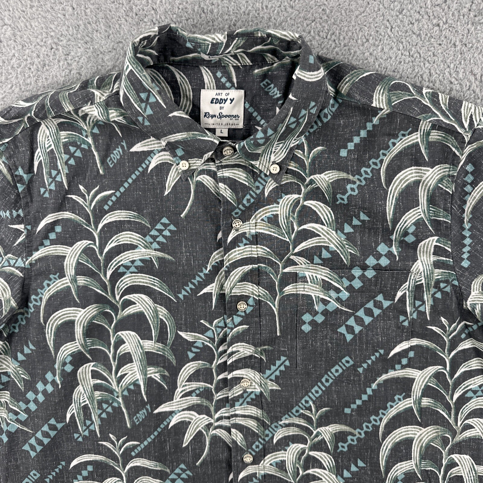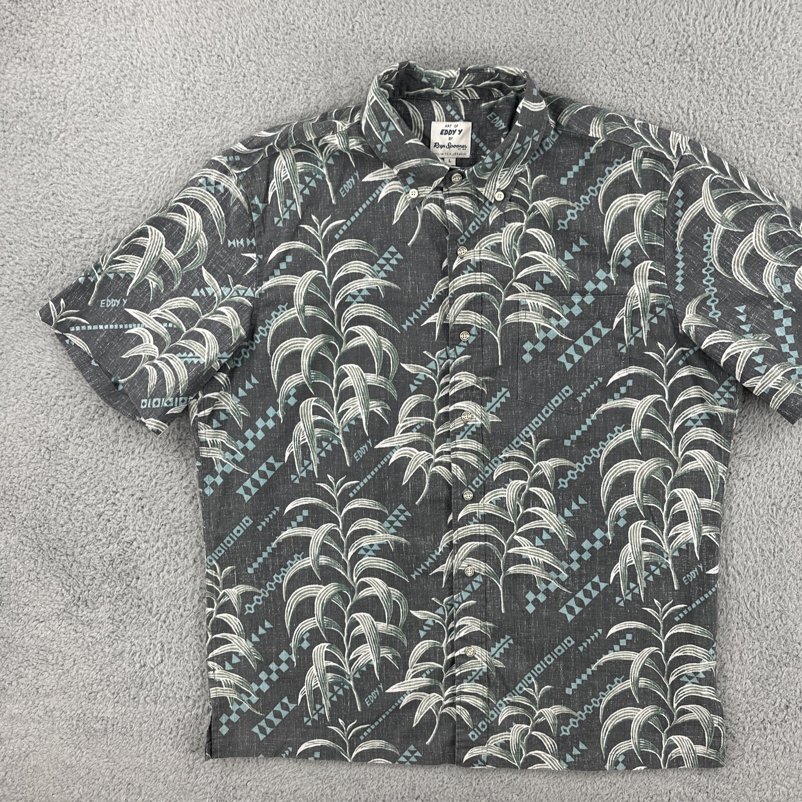 This is a Reyn Spooner button-down Hawaiian shirt in size L, featuring a short sleeve, collared neckline, and a colorful art design inspired by Eddy Y. With a vintage aesthetic, the shirt is made of polyester and cotton knit fabric, with button accents and a button-down collar. It has a regular fit, suitable for all seasons, and includes pockets, making it a breathable and tropical-themed piece for a casual or luau-inspired look. No holes or stains See pictures for pictured measurements compare with your favorite garment and ask questions if you have any Add to your collection today Browse my other items I can combine shipping
