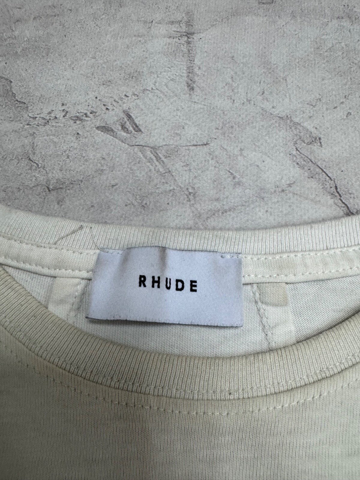 The product is a RHUDE "God Help Mee" tee in size L, featuring a relaxed fit and short sleeves. It comes in a beige color and is designed for men.