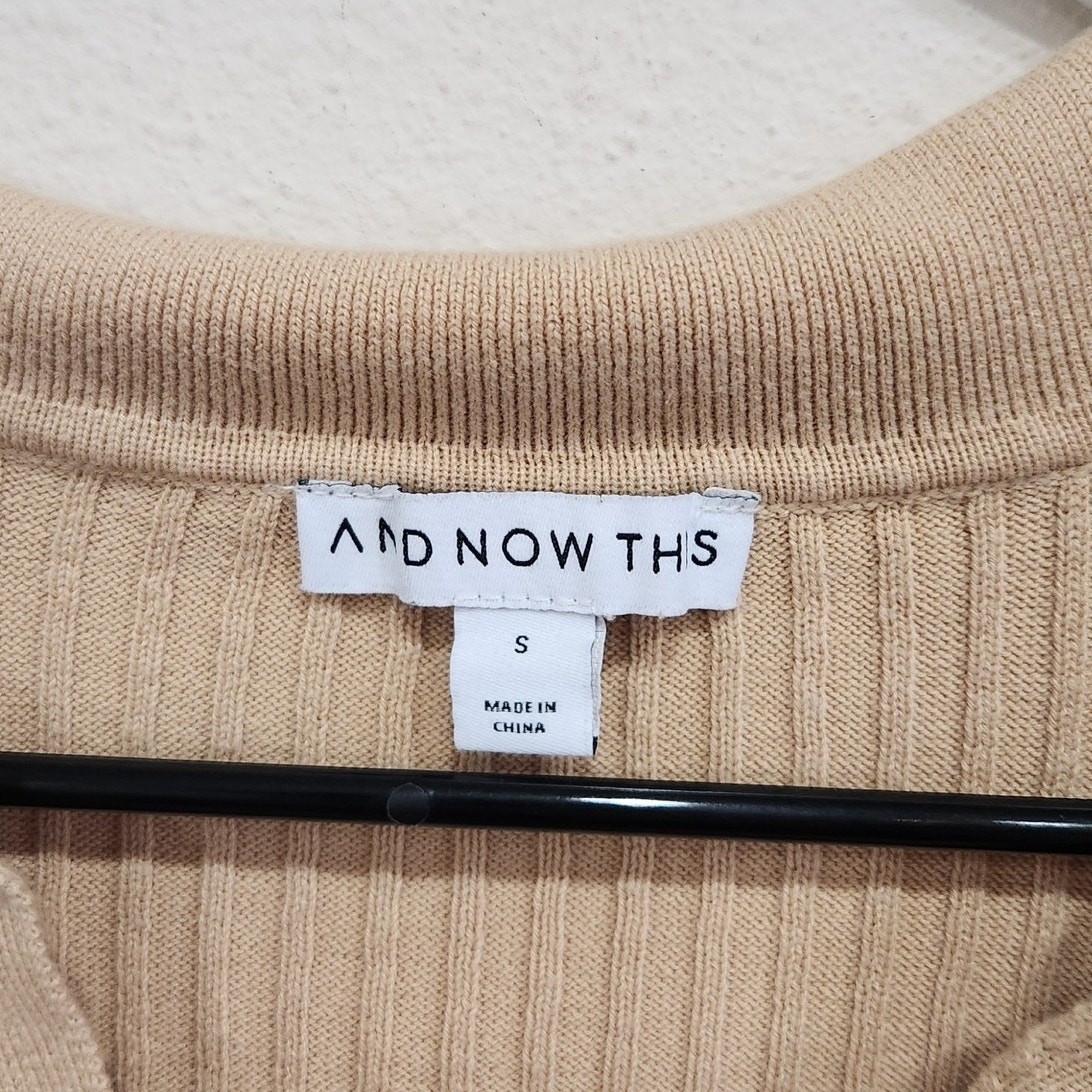And Now This Ribbed Crop Polo Shirt Pullover Long Sleeve Slim Fit Tan Size Small Good pre-owned condition. Features: Stretch rib knit Slim fit Pullover style Cropped cut V-notch neckline Fold-over open collar Long, close-fitting sleeves Cotton, Rayon