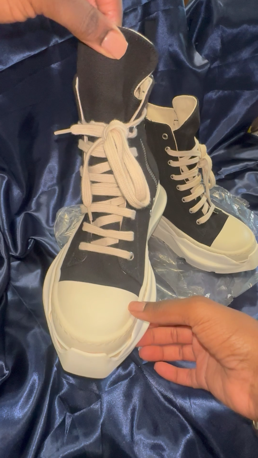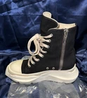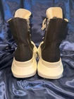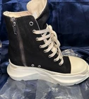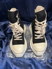 The Rick Owens DRKSHDW Abstract High Sneakers in size 38.5 are a stylish and versatile choice for women looking for a unique athletic shoe. The black color with a touch of milk adds a modern and edgy flair to the high top sneaker design. These sneakers by Rick Owens are known for their quality craftsmanship and attention to detail, making them a fashionable and functional addition to any wardrobe. Keep in mind that they run small, so it may be necessary to size up for a comfortable fit. This style shoe runs small, they’re an 8 1/2 but fits more like an 8. Gently used !