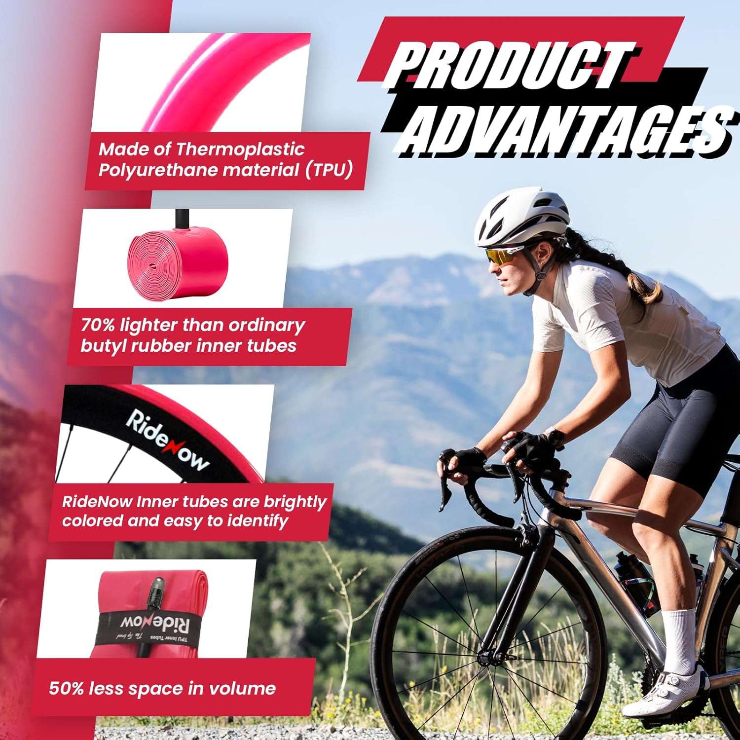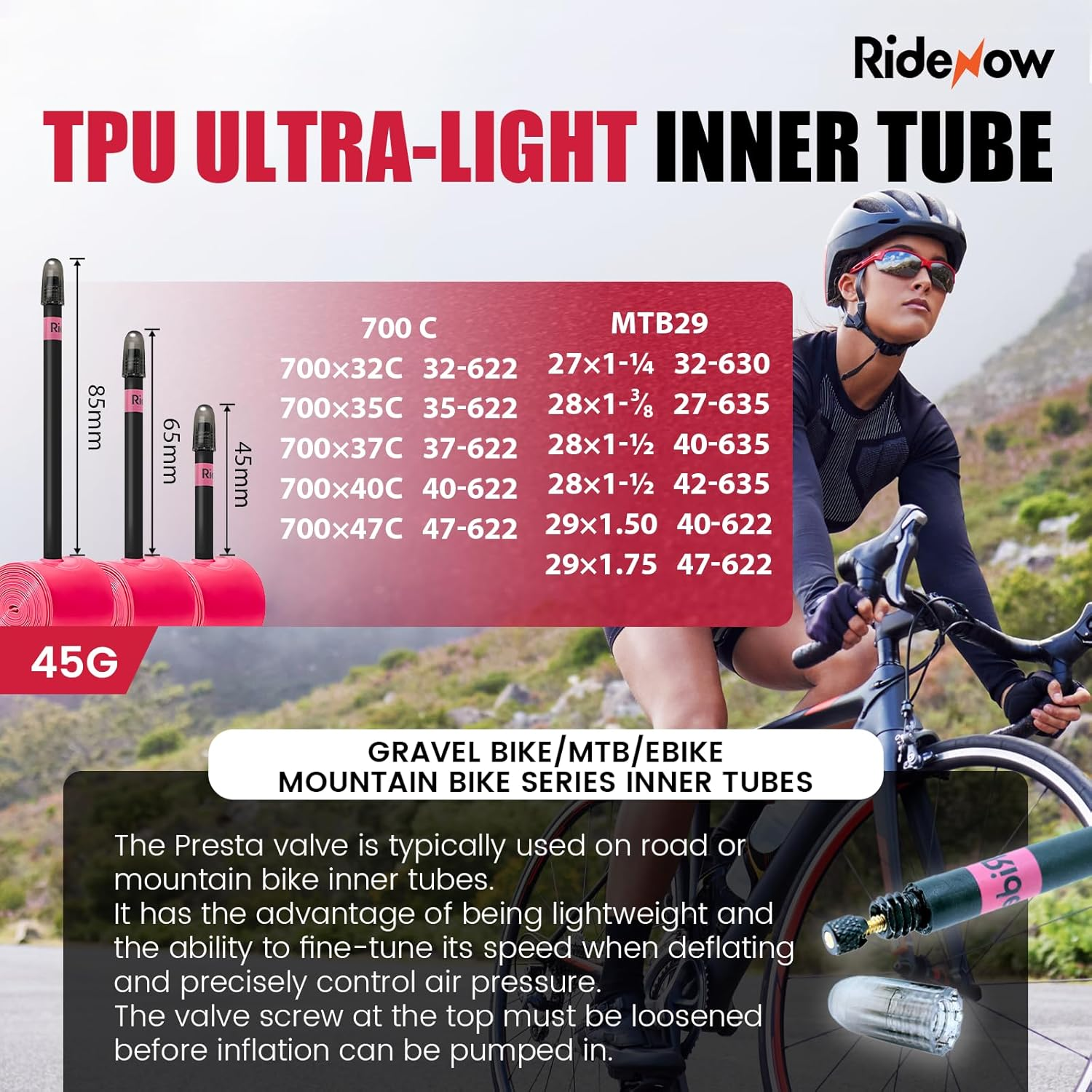 Store New Arrivals Add to Favorite View Feedback Contact Ridenow Bike Tire Tube for Road/Gravel/Mtb/Bmx, Bike Inner Tube with 45Mm/65Mm/85Mm Presta Valves, Lightweight & Puncture Resistant TPU Inner Tube(Include Bike Tube Patch Repair Kits), 2/4 Pcs Description Valve Type Presta Part Number gravel 700/32C-47C 45g-45-2 Warranty Description 1 Year Item Diameter 29 Inches Wheel Size 29 Inches Compatible Tire Width Maximum 58.4 Millimeters Color 2 pack 45mm valve Included Components TPU Inner Tube*2, Patch Repair Kits Material TPU Suggested Users unisex-adult Package Weight 0.1 Kilograms Sport Type Cycling Valve Length 45 Millimeters Bike Type Gravel Bike Model Name Bike Inner Tube Compatible Tire Width Minimum 32 Inches Size gravel 700/32C-47C 45g Item Package Dimensions L x W x H 3.62 x 2.05 x 1.81 inches 【Ultra-light Inner Tube】Made of thermoplastic polyurethane elastomer material (TPU), it weighs 70% less than ordinary butyl rubber inner tubes and takes up 50% less space when placed in the pocket, these bicycle inner tube weigh a mere 45g, the inner tubes are brightly colored, easy to identify, making it easy to carry and very suitable as a portable spare inner tube 【Strong and Puncture Resistant】The new TPU material has good puncture resistance, wear resistance, durability and anti-aging. They ward off sudden flats and maintain stable performance, even at lower tire pressures. In addition, the TPU material is oil and water resistant, and has excellent load-carrying capacity and impact resistance 【Enhanced Air Tightness】These road bike inner tube feature presta valves ensuring superior air tightness and reliability. Choose from 45mm/65mm/85mm valve lengths to suit your bike rim. Engineered for both disc and rim brake systems, these bicycle inner tubes cater to a diverse range of road vehicles. They excel in challenging racing and riding conditions 【Fits Multiple Tire Sizes】This Gravel series Inner Tube is compatible with many tire sizes: 700/32C-47C (Includes Bike Tube Patch Repair Kits). Ridenow offers three versions in weight for Gravel bike series Inner Tube: 45g 【Proper Inflation Instructions】To prevent irreversible damage, avoid overinflating the inner tube when not installed in the tire. When installing, start with an initial inflation of 0.5 PSI, ensuring that the inner tube adheres closely to the tire's inner wall Product Description ABOUT US We offer the best prices around on high quality products. Our E-store includes media such as books, movies, music and games while offering electronics, toys, sporting apparel, clothing, tools, general home, garden items and more. SHIPPING We are always working hard to ensure your package arrives as soon as possible. Please understand that some factors like weather, high postal traffic, and the performance of shipping companies are outside of our control. We offer free shipping to the lower 48 states and ship within 2 business days of payment, usually sooner. We do not accept P.O. Boxes. Please provide a physical address. For shipping outside of the continental USA, we only use eBay's Global Shipping Program.The item is shipped to KY and then sent to the rest of the world. International customers are responsible for all duties and taxes. Continue to check out in order to calculate costs for shipping the item to your country. Messages regarding eBay's Global Shipping Program MUST be directed at eBay EXCLUSIVELY. RETURNS We offer a 30-Day Return Policy on items which you are not completely satisfied with. You have the option for a full-refund or an exchange of the item. No returns are available on items shipped outside of the USA. PAYMENT We accept PayPal. CONTACT US This page content is yet to come Please ad us to your favorite seller and visit again later Thank You CUSTOMER SATISFACTION We try our very best to make sure every customer is completely satisfied. If there's a problem, message us! We're happy to help. WE ACCEPT Copyright © 2021 AutoDS. | All Rights Reserved
