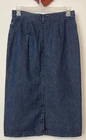 This Riders Women's Size 8 petite Blue Long Cotton Blend Denim Skirt is a stylish and versatile addition to any wardrobe. Made from a comfortable cotton blend with a touch of polyester and spandex for stretch, this straight-fit skirt features a solid blue color and a slit on the back for added flair. The button and zipper closure, along with convenient pockets, make it practical for everyday wear. Perfect for all seasons, this maxi-length skirt from a trusted brand like Riders is sure to become a go-to piece for any woman's closet. Total length: 31 inches. Waistband: 15.5 inches across laying flat.