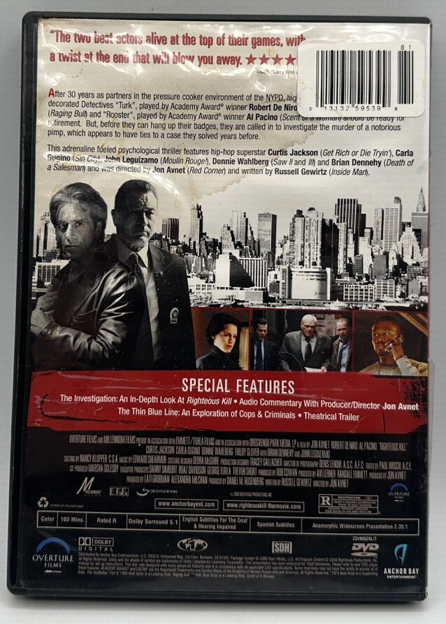 Get ready for an action-packed movie night with "Righteous Kill" on DVD. Starring Al Pacino and Robert De Niro, this cult classic follows the story of a police officer who investigates a murder while infiltrating an illegal drug ring. With a runtime of 101 minutes, this movie is perfect for any fan of the action and adventure genre. This DVD comes in a tall case and features widescreen format, making it a great addition to any collection. The subtitles are available in English and Spanish, and the movie is rated R. Directed by Jon Avnet and produced by a talented team including Alexandra Milchan, Avi Lerner, and Randall Emmett, this DVD is sure to be a hit. Don't miss out on the opportunity to own "Righteous Kill" today.