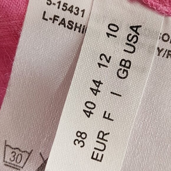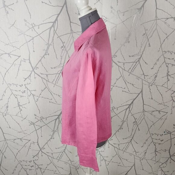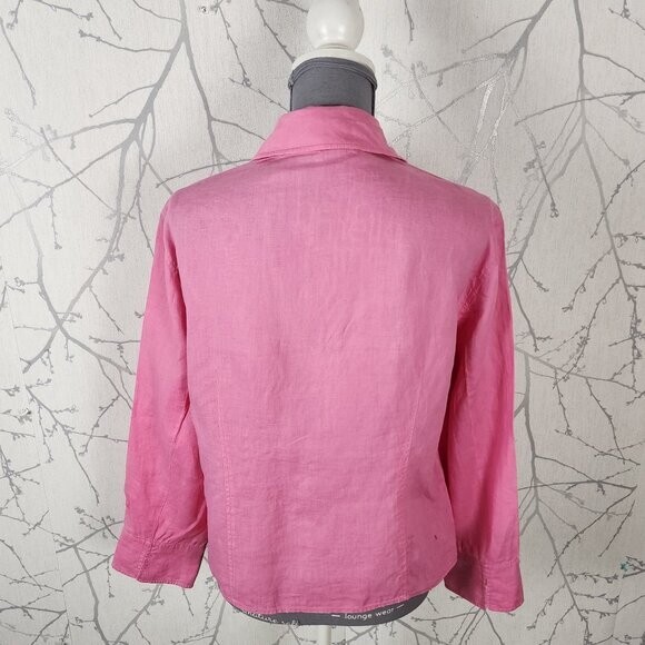 Ril's Pink 100% Linen Button Front Collared V-Neck Blouse style tags: linen, sustainable, breathable, coastal, vacation, feminine Women's 10 Chest: 21" Length: 24" Good used condition: no rips, marks or stains.