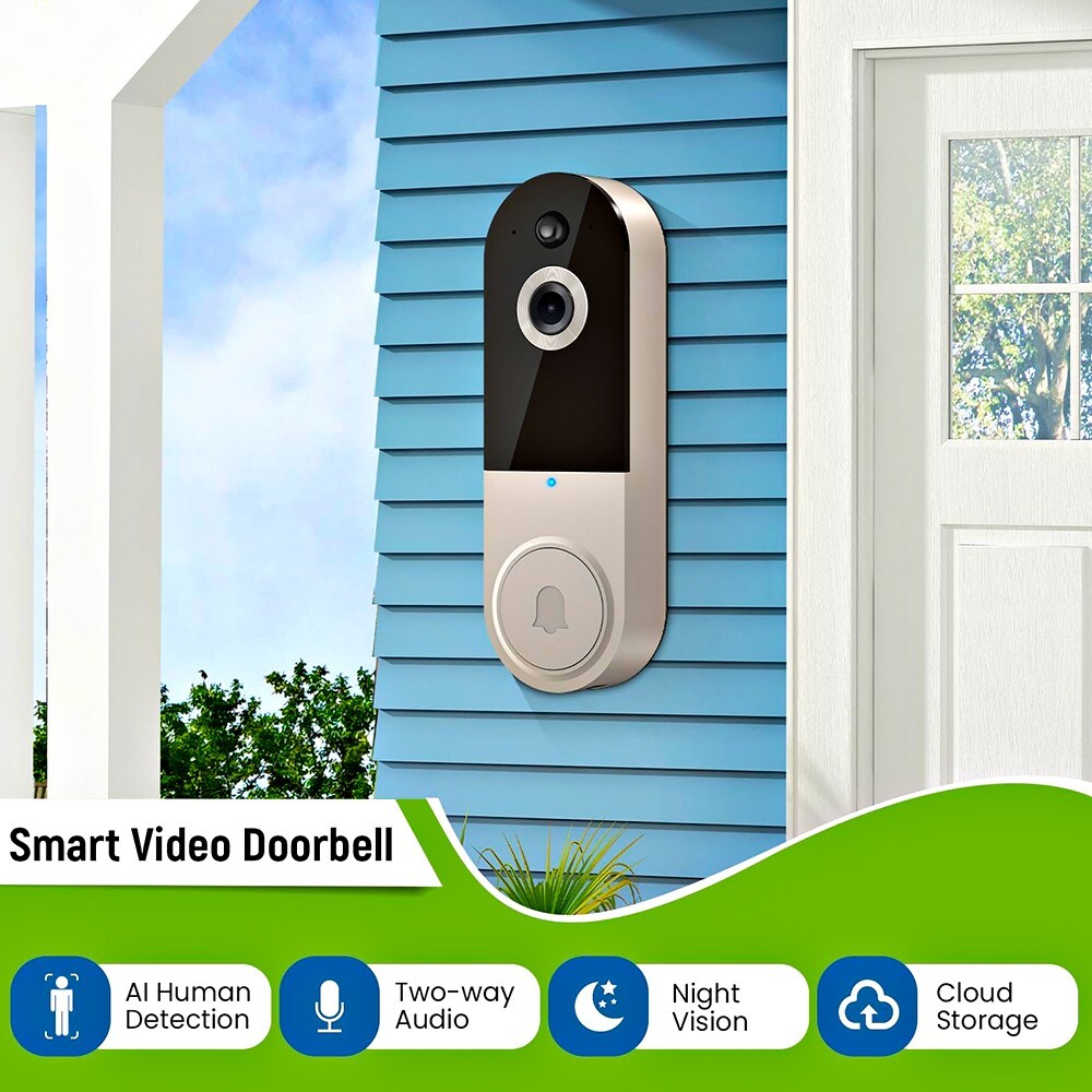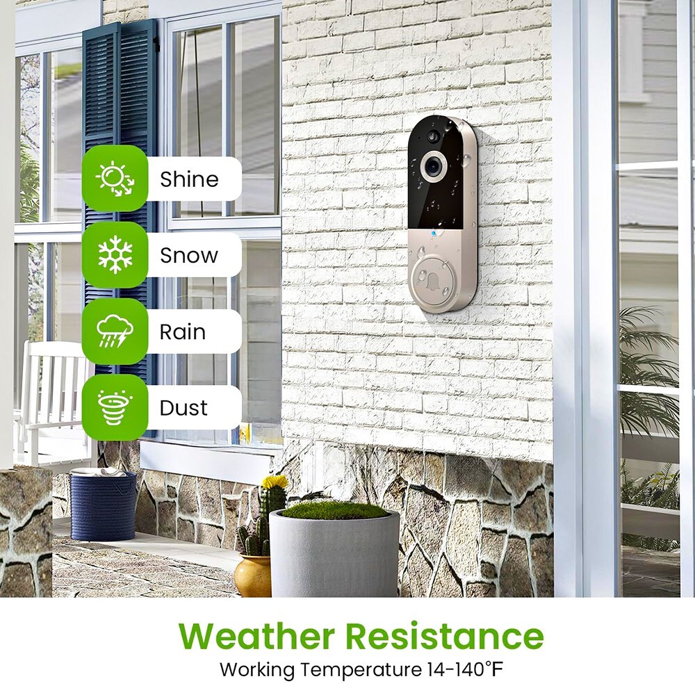 WI-FI SMART HD VIDEO DOORBELL WITH CHIME TWO-WAY AUDIO NIGHT VISION MOTION SENSOR INDOOR/OUTDOOR SURVEILLANCE LIVE VIEW INTEGRATED HOME SECURITY SYSTEM INTELLIGENT AI HUMAN DETECTION 2.4GHZ WI-FI COMPATIBILITY Absolutely great doorbell camera! Awesome 1080P HD video quality! Reliable security of your home! Simple to set up! You can talk to delivery people through the doorbell when you're not home! Clear voice sound when talking and records when needed! Extreme Viewing Experience Watch live video streams through a 1080p wide-angle lens. Advanced Human Recognition Technology Leverage AI capabilities to distinguish between human presence and other moving objects like cars and pets. Interactive Two-Way Audio Communicate with visitors directly and in real time from any location for smooth interactions. Integrated Home Security System Equipped with a long-lasting 5200mAh battery. An included indoor noise alert system. Night Vision Wide-Angle 4 infrared LEDs Smart IR sensor. Continuous surveillance, clear video capture in low-light. Weather Resistant Reliable year-round functionality. Indoor Chime Included Multiple chimes can be synced with one doorbell. 2.4GHz Wi-Fi Compatibility This doorbell is tailored for 2.4GHz Wi-Fi networks. A steady and quick connection. NOTE: 5GHz Wi-Fi not supported. Optional AES-128 Cloud Storage Choose an optional subscription for AES 128-bit encrypted cloud storage (sold separately) and enjoy video recording, playback, sharing.