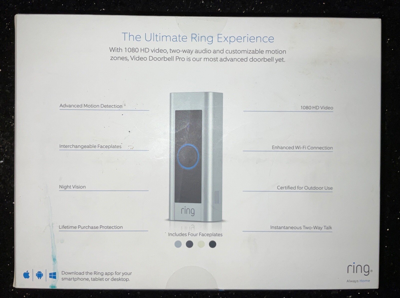 Elevate your home security with the Ring Video Doorbell Pro, a modern solution for monitoring your property. This sleek device, finished in polished nickel, is not only aesthetically pleasing but also packed with features like night vision, motion activation, and video recording. The 180-degree view ensures comprehensive coverage of your doorstep, while the built-in microphone allows for two-way communication, making it an excellent choice for both home and business use. With compatibility for smart home systems such as Alexa and Google Assistant, the Ring Video Doorbell Pro integrates seamlessly into your existing setup. The wireless connectivity, powered by Wi-Fi, ensures easy installation without the need for costly wiring. The package comes complete with a user manual, mounting bracket, security sticker, and the doorbell itself, all designed to deliver both security and convenience to your front door. *Includes four faceplates for customization