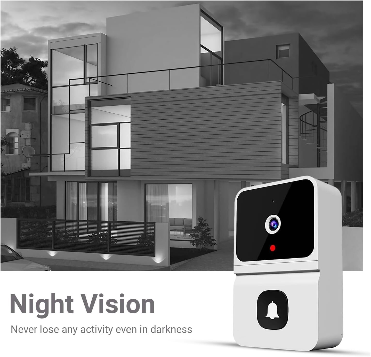 Ring Video Doorbell 1080p HD Camera WI-FI Night Vision Motion Detection Wireless Discription [Two-way Audio Talks]: With a video doorbell built-in two-way audio, you can easily communicate with visitors or delivery personnel from anywhere. Whether at home or on the go, you can greet guests or deter unwanted visitors in real-time. [2.4Ghz WiFi Connection]: The video doorbell camera uses 2.4Ghz WiFi to ensure a fast and stable connection (does not support 5Ghz WiFi). [Night Vision]: Outdoor doorbell camera comes with high-definition IR night vision which captures clear pictures and videoi even in low-light conditions, keeping your home safe day and night [Advance PIR Motion Sensor]: Smart doorbell camera with chime use radar and PIR to minimize false alerts. It supports intelligent human detection can distinguish between near and far objects' track, and judge whether they are people or animals.