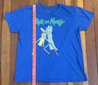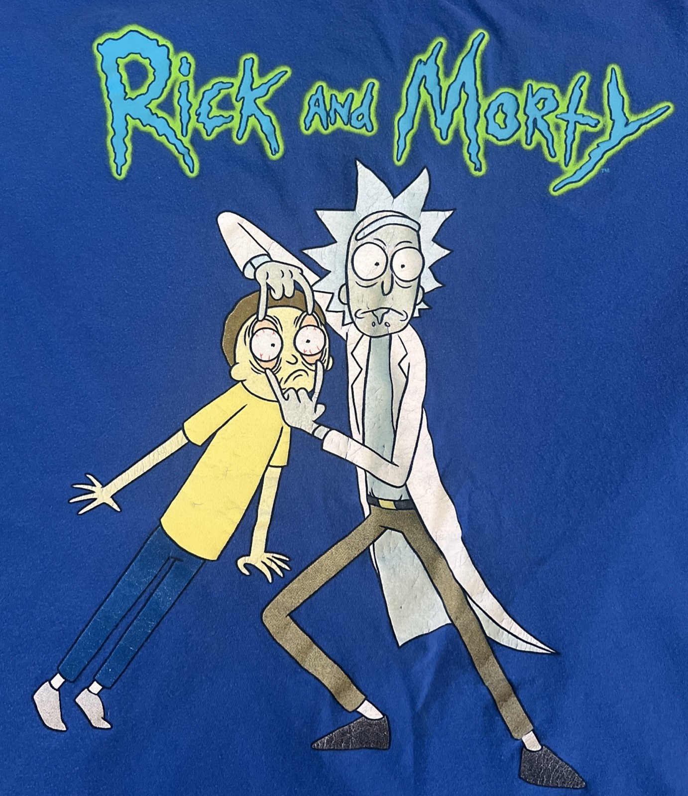Embrace your love for the animated hit show Rick and Morty with this vibrant blue graphic T-shirt from Ripple Junction. Featuring the iconic characters Rick and Morty, this unisex adult shirt is a must-have for fans. The shirt is designed with a comfortable crew neck and short sleeves, making it a great fit for all seasons. Crafted from 100% cotton knit fabric, this T-shirt provides easy care and durability. It is machine washable and features a tagless design for added comfort. The shirt comes in size XL and is a regular fit. Perfect for those who love cartoons and funny classic graphic prints. This shirt looks good. Some fading and cracking, see photos. Clean and ready to wear.