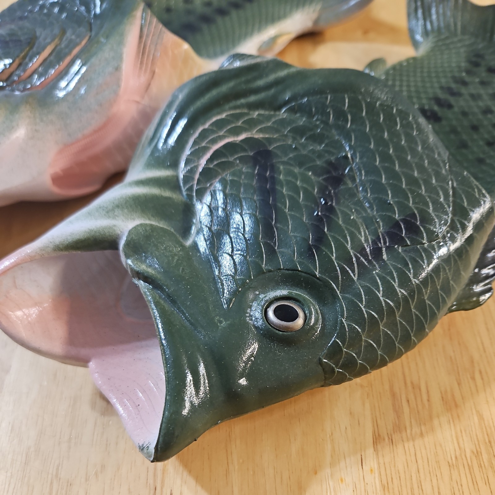 These Rivers Edge Bass Fish rubber slide sandals are designed for men in size 11/12 M. Featuring a fisherman character and fish pattern, these green sandals have a vintage style with a colorful and fun design. Made with a rubber outsole and upper material, these slide sandals are perfect for outdoor activities. The slip-on style and adjustable features make them easy to wear for any man looking for a unique and stylish footwear option.