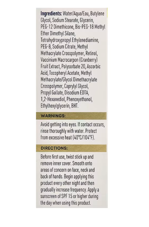 Contains Retinol, Non-Acnegenic, Non-Comedogenic, Colorant-Free, Dye-Free, Oil-Free, Alcohol-Free, Contains Glycerin, Hypoallergenic, Animal Cruelty-Free, Paraben-Free, Contains Antioxidants