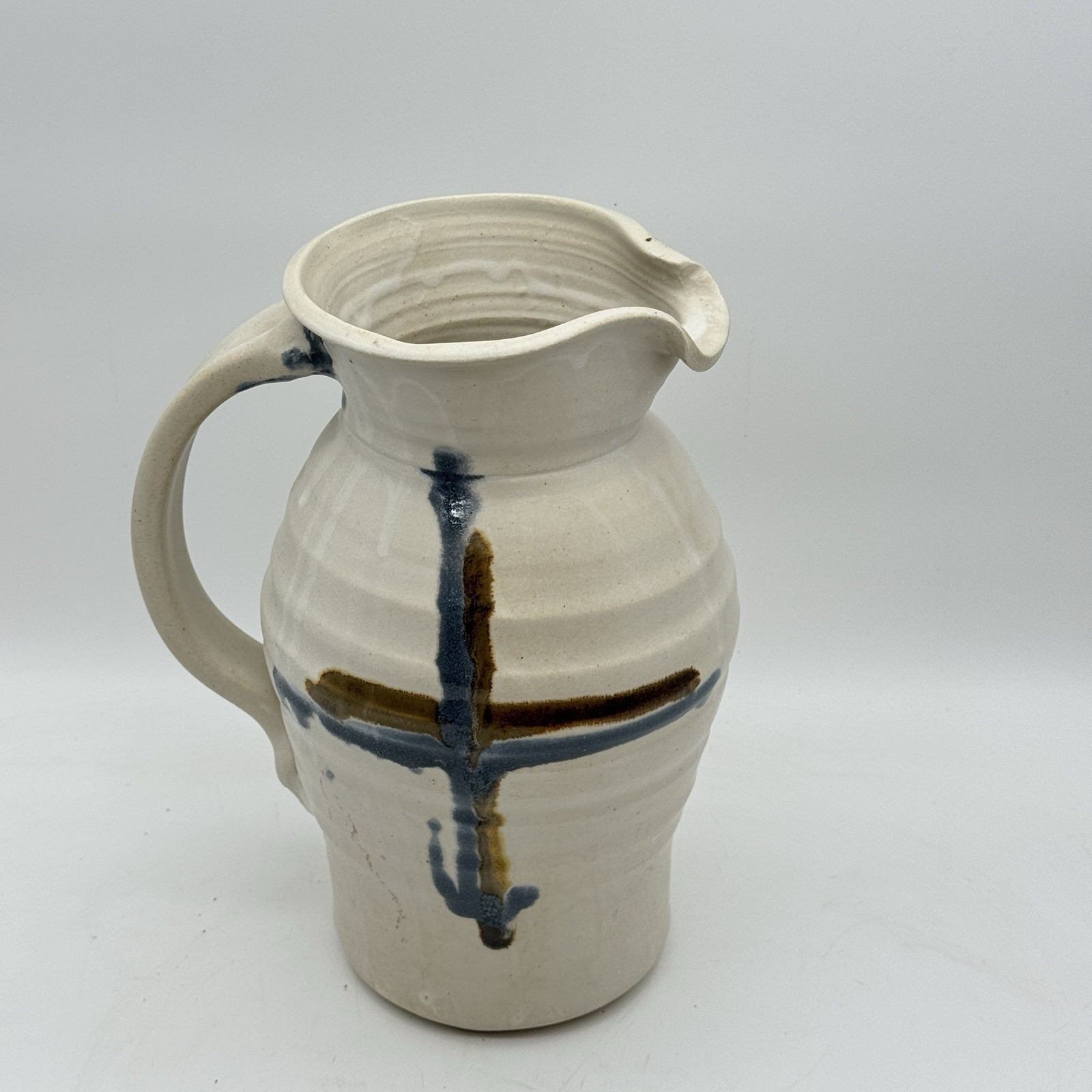 This beautiful 10" handmade pitcher vase is a one-of-a-kind piece created by Rob Grimes. The vase features an abstract cross pattern and is signed by the artist. It is made of high-quality clay pottery and is perfect for displaying your favorite flowers or as a standalone statement piece. No chips or cracks.