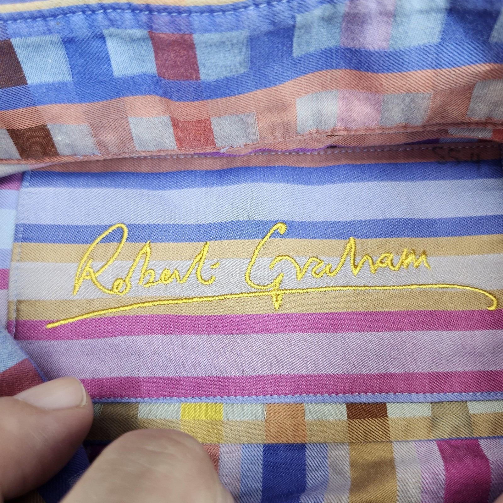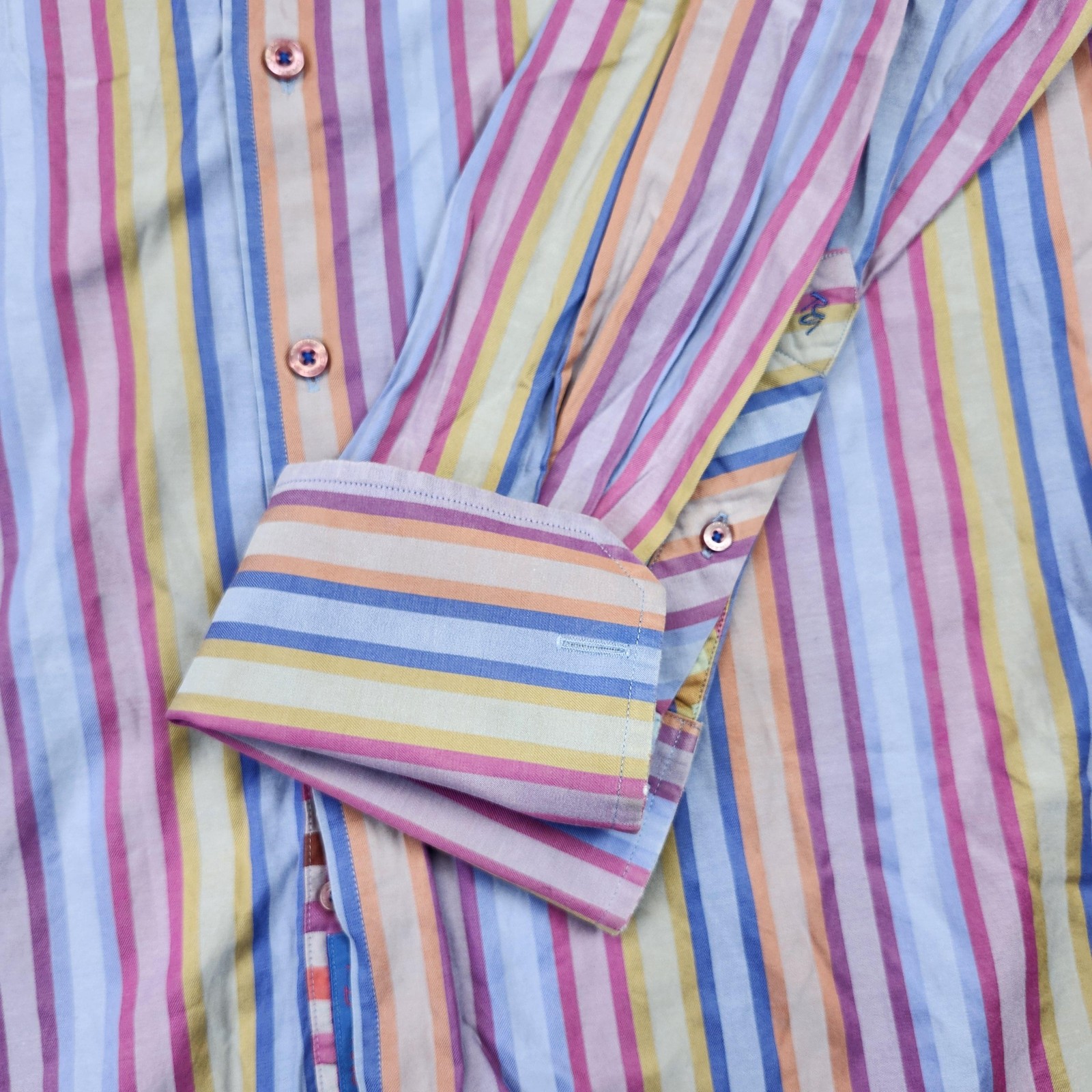 Brand: Robert Graham Type: Long sleeve button-up shirt with spread collar Tag size: Mens XL Color/Pattern: Multicolor vertical stripes in pastel tones (pink, blue, yellow, purple, orange) Features: Flip/contrast cuffs with multicolor check pattern; decorative buttons; curved hem; no chest pocket Label details: Robert Graham script at neck; "Knowledge Wisdom Truth" ribbon inside placket Country of origin: Made in India Notes: See photos for sizing reference and details of cuffs and placket.