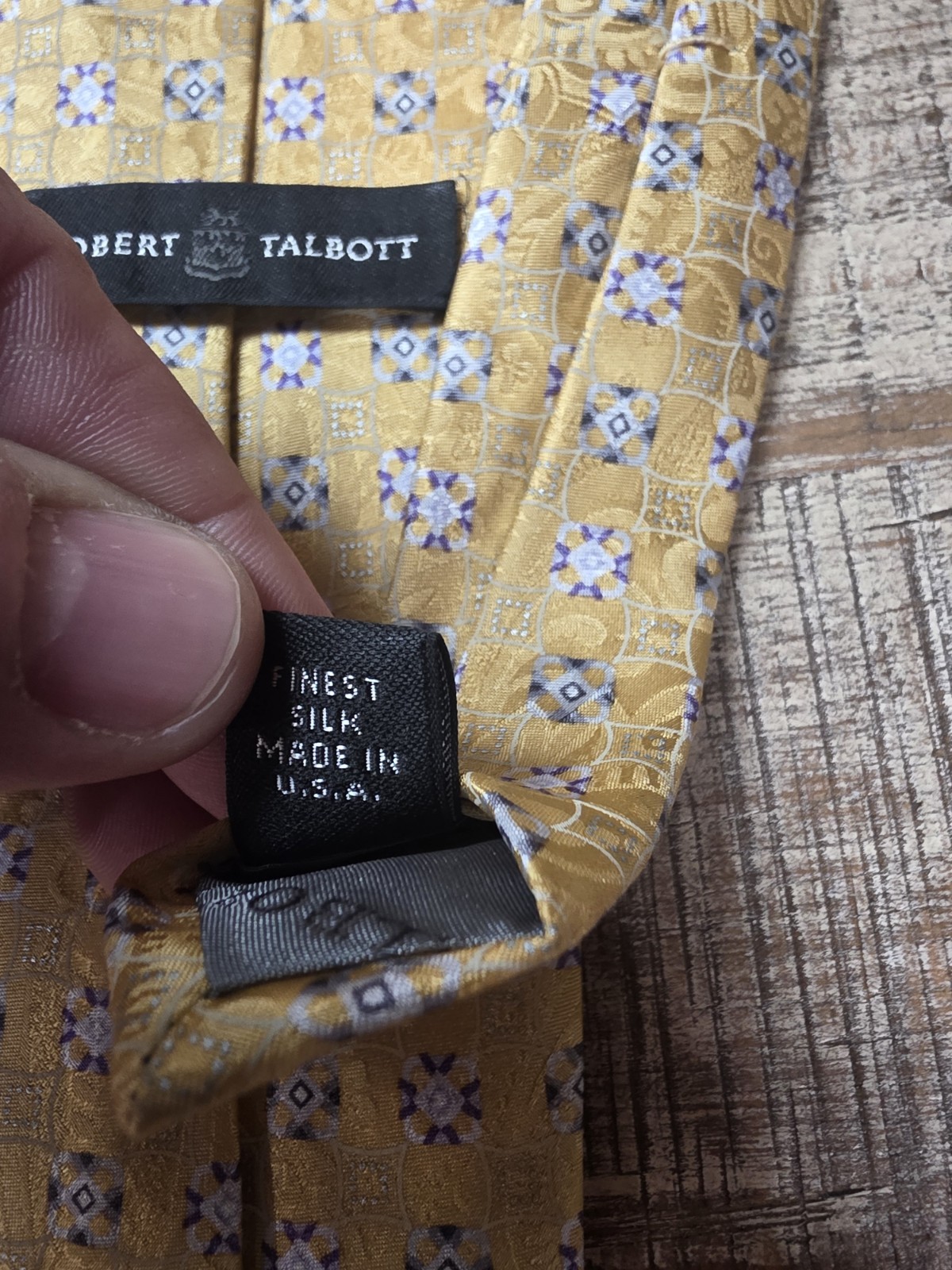 Elevate your wardrobe with this Robert Talbott luxury silk necktie, crafted in the USA from 100% finest silk. This tie features a rich gold base with an elegant geometric check pattern accented by subtle blue and lavender tones—perfect for business, formal events, or refined everyday wear. Known for exceptional craftsmanship and timeless style, Robert Talbott ties are a favorite among professionals who appreciate quality and sophistication. Details: Brand: Robert Talbott Material: 100% Silk Color: Gold with Blue & Lavender Geometric Pattern Made In: USA Style: Classic / Luxury / Business / Formal Width: Approx. 3.75 inches at widest point Length: Approx. 60 inches Condition: Very good pre-owned condition. No stains, holes, or noticeable flaws. Clean and ready to wear. 📦 Ships fast and securely