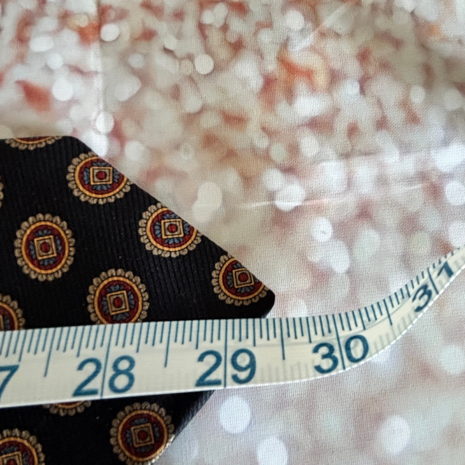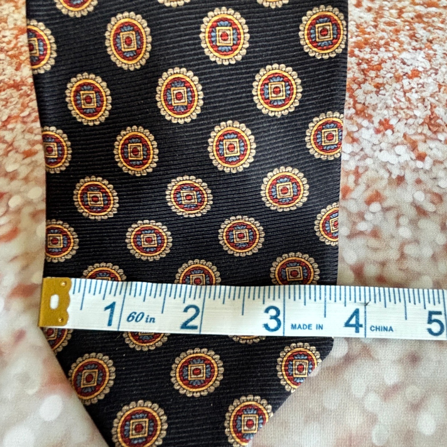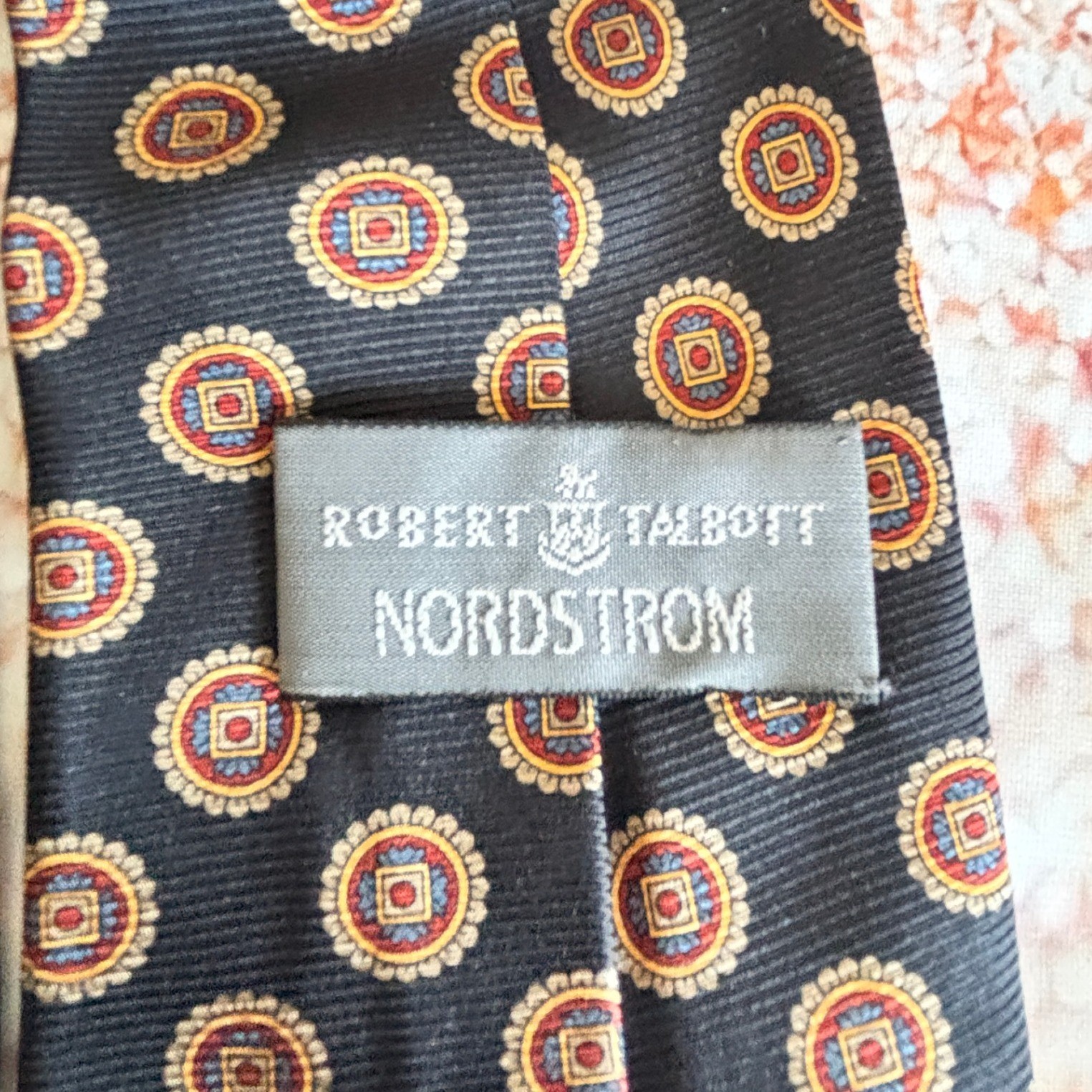 Refined sophistication takes center stage with this Robert Talbott necktie, a testament to timeless elegance. Circular medallions, each detailed with classic square and petal motifs in gold, red, and blue, stand out against a textured, dark background. Its hand-sewn quality and luxurious imported silk ensure it feels as good as it looks. Wear it to seal a crucial business deal, to elevate your personal style at a semi-formal gathering, or to add a touch of class to a romantic dinner. Measurements: • Length: 58 inches • Width: 3.5 inches Color: Black Department: Men Type: Tie Material: Silk, 100% Silk Style: Designer Pattern: Geometric Character: Hero, Angel, Bill, Happy, Lucas Accents: Medallion Fabric Type: Silk Blend Keywords: Robert Talbott, Nordstrom, Necktie, Silk tie, Medallion, Hand Sewn, Black tie, Gold tie, Men's fashion, Formal wear, Business attire, Designer tie, Statement tie, Imported silk, Made in USA **Sold by a Proud Military Family** ~10% of every item I sell is donated to our charity - Veterans Community Project. Please visit my eBay store for all the items I have listed to help this great cause.
