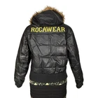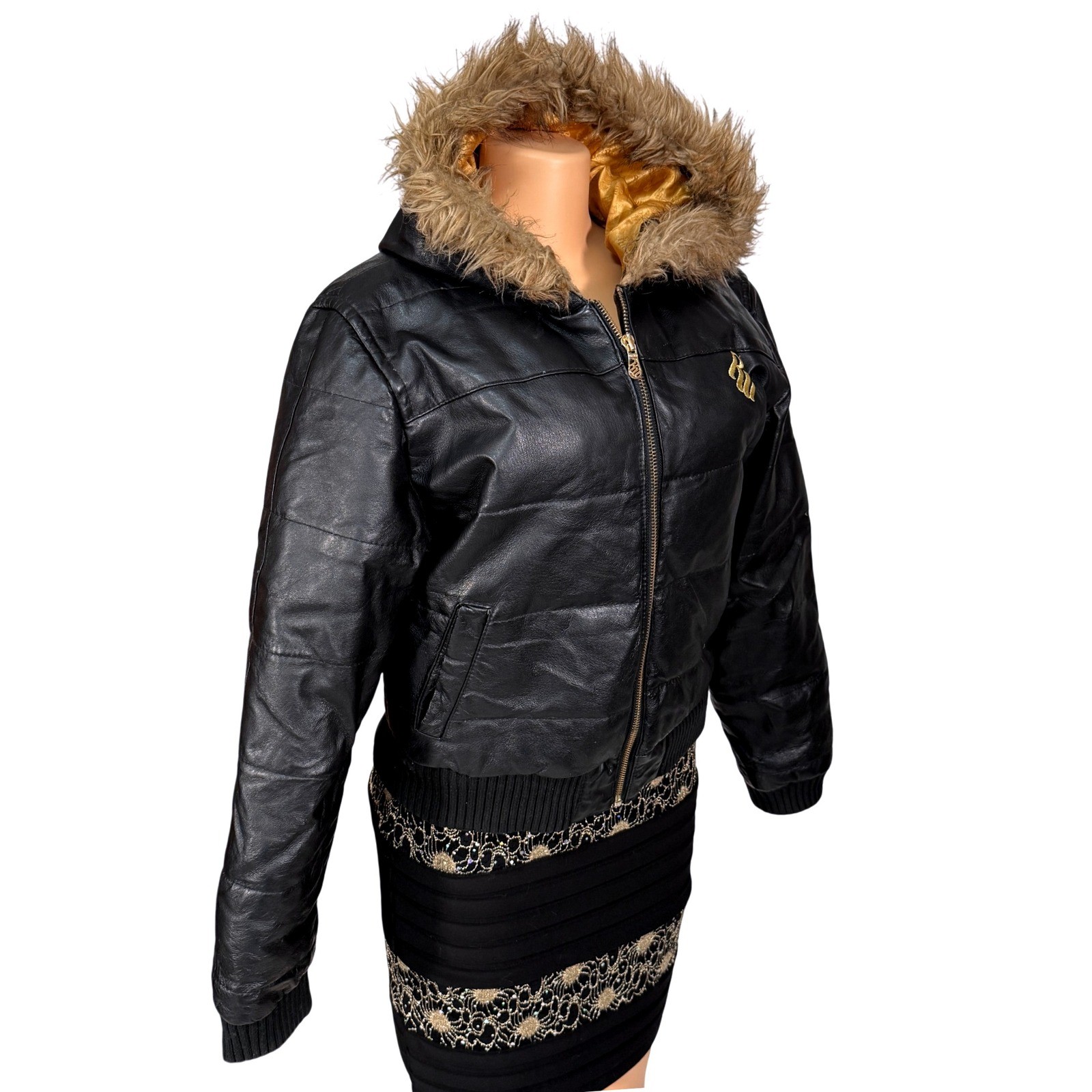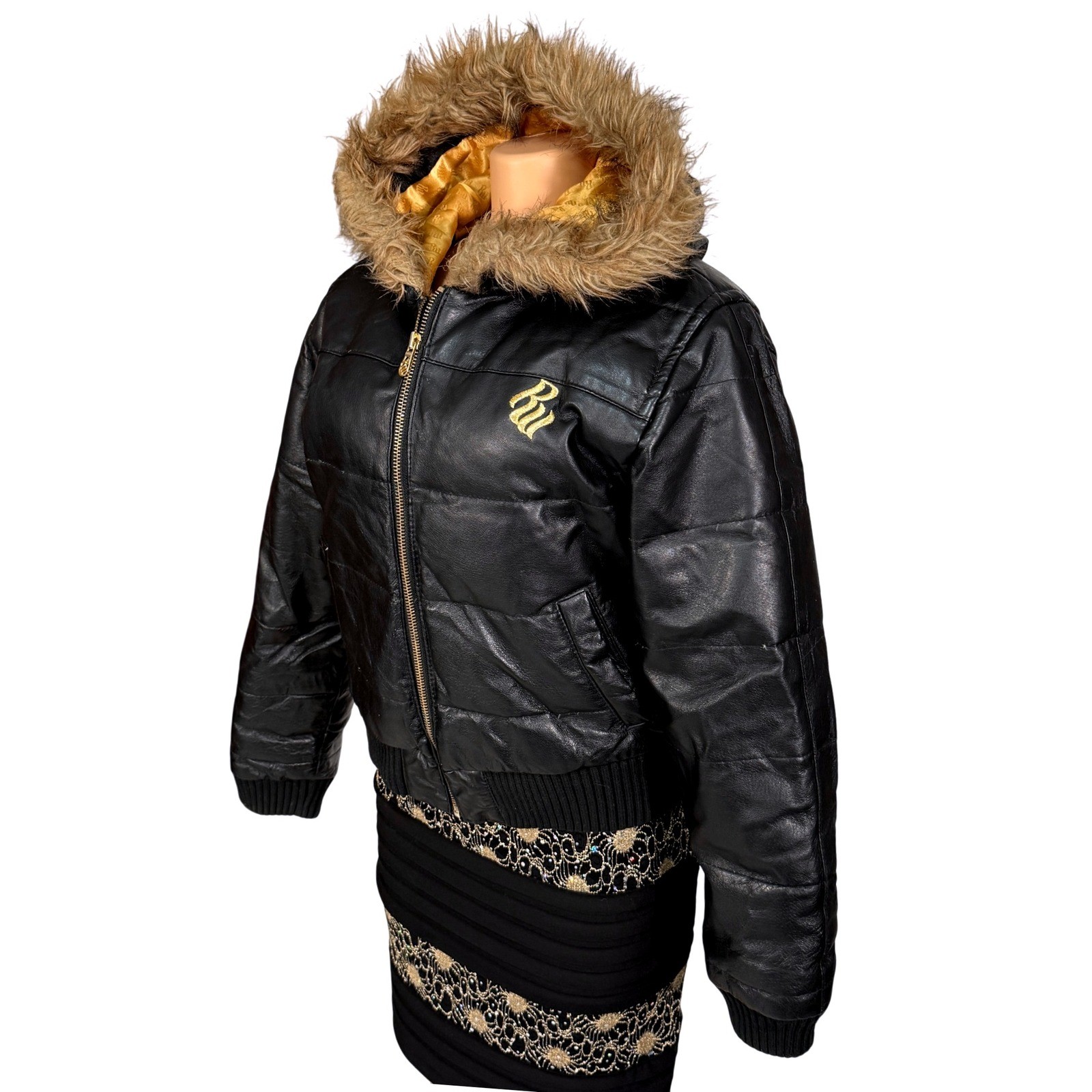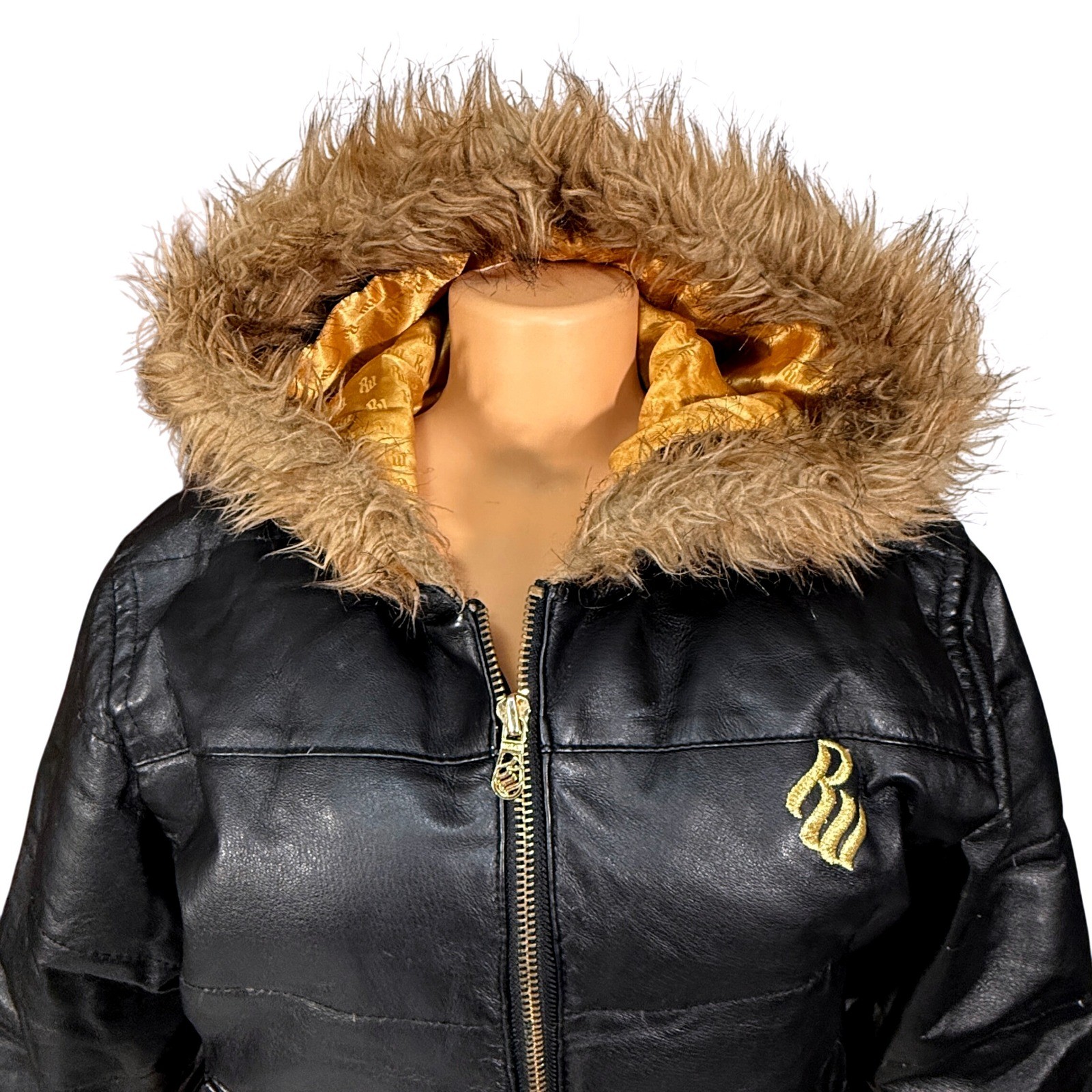 A stylish black leather puffer jacket with a luxurious fur-trimmed hood. This eye-catching jacket showcases the iconic Rocawear logo embroidered in gold on the back and a smaller logo on the chest, adding a touch of urban flair. The quilted design and ribbed cuffs and hem provide a comfortable and secure fit, while the bright gold interior lining offers a pop of unexpected color. Measurements: • Chest (pit to pit): 19 in • Sleeve length: 23 in • Jacket length: 22 in • Shoulder to shoulder: 16 in Type: Jacket Style: Puffer Jacket Department: Women Theme: Designer, Rock Accents: Fur Trim, Logo, Quilted Features: Full Zip, Lined Pattern: Solid Puffer jacket, Women's jacket, Fur hood jacket, Winter jacket, Fashion jacket, Streetwear jacket, Urban fashion, Black puffer, Gold logo, Quilted jacket, Designer jacket, Hip hop fashion