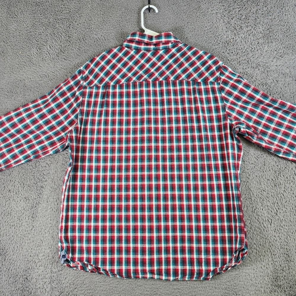 Classic plaid button-down shirt in red and teal. Features two front chest pockets with button closures. Long sleeves with button cuffs. Regular collar. Made from soft cotton blend fabric. In good pre-owned condition with no significant flaws or damage. Collar Style: Point Type: Button-Up Neckline: Collared Color: Multicolor Sleeve Length: Long Sleeve Department: Men Fabric Type: Woven Closure: Button Pattern: Plaid Accents: Button Material: Cotton, Polyester Blend Fit: Classic Keywords: plaid shirt, button down, long sleeve, casual shirt, checkered, rocawear, mens shirt, front pockets, collared shirt, classic fit all items have been cleaned and disinfected we stand behind all we sell so please contact us if you have an issue with any order