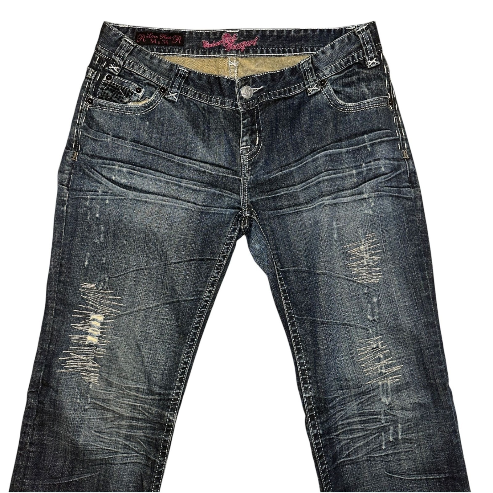 Features: • Brand: Rock and Roll Cowgirl • Type: Jeans, Bottoms • Style: Straight Leg • Front: Flat • Season: Spring, Summer, Fall, Winter • Pattern: Solid • Made in China • Care: Machine Wash • Rise: Low • Color: Blue, Black, Silver • Wash: Medium • Features: Embroidered, Studded, Rhinsetones, Distressed, Frayed, Stitched • Closure: Zipper Fly • Material: Denim, 98% Cotton, 2% Spandex, Lighterweight • Size: Women's Plus Size 34 • Condition: Good, Some fading & wear, Laundry scent • Other: Western, Cowboy, Cowgirl, Dance, Rodeo, Show Measurements are Approximate: Length: 42 in / 107 cm Waist: 17.5 in / 44 cm Hips: 22 in / 56 cm Front Rise: 8.5 in / 22 cm Thigh: 12 in / 30 cm Inseam: 32 in / 81 cm Width at hem of leg: 9.5 in / 24 cm Orders shipped within 1-2 business days. 0101087901