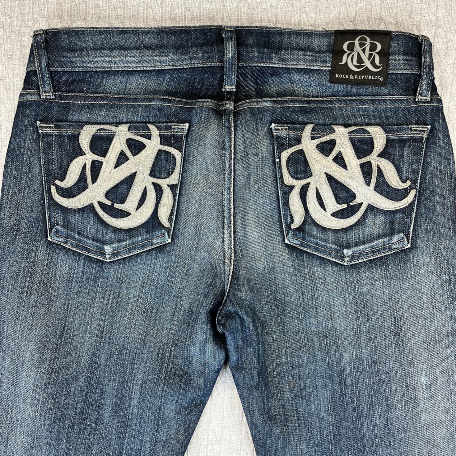 excellent distressed, vintage whiskered looking condition please examine all photos for flaws, measurements and exact fit Measurements: • Waist: 30 Style: Bootcut Department: Women Fabric Wash: Medium Waist Size: 30 Accents: Logo, Embroidered Type: Jeans Features: Pockets, Distressed, Stretch, Comfort Fit: Slim Pattern: Solid Rise: Mid (8.5-10.5 in) Fabric Type: Denim Keywords: Rock Republic, bootcut jeans, dark wash, embellished pockets, designer denim, women's fashion, trendy, stylish, signature style, everyday wear, denim