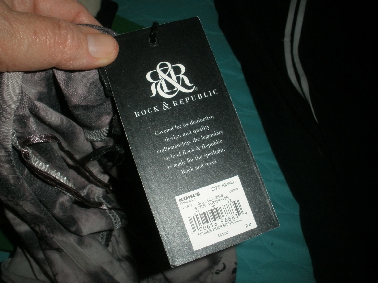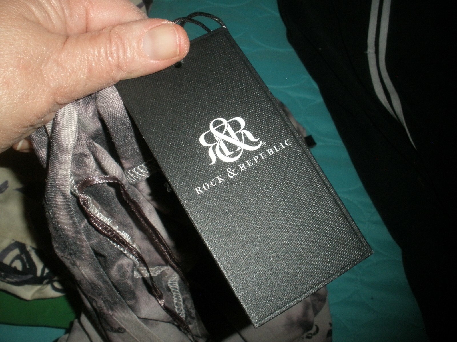 this is for a Rock & Republic Shirt It is new with tags , It has no rips, tears or stains. MRSP is $44 IT is made of cotton and polyester The shirt is gray/purple. IT has a modern day tye dye look. It has large graphic on the front that is highlighted with studs. It has lots of stretch. IT is sleeveless. IT has a longer tail in the back. It measures armpit to armpit laying flat is 20" It measures down the back 30". It is a size Small due vary please check measurements. If you have any questions or problems - before or after. Please message me. .