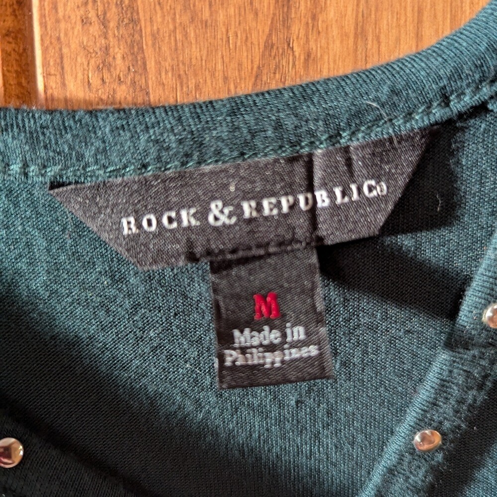 Rock & Republic brand, studded and open collar and sleeve top. Very soft jersey type fabric in green. Any other questions please ask. Thank you for browsing my collection, I add new items daily! If you like the item and not the price, make an offer, I accept reasonable offers!