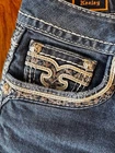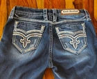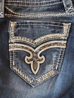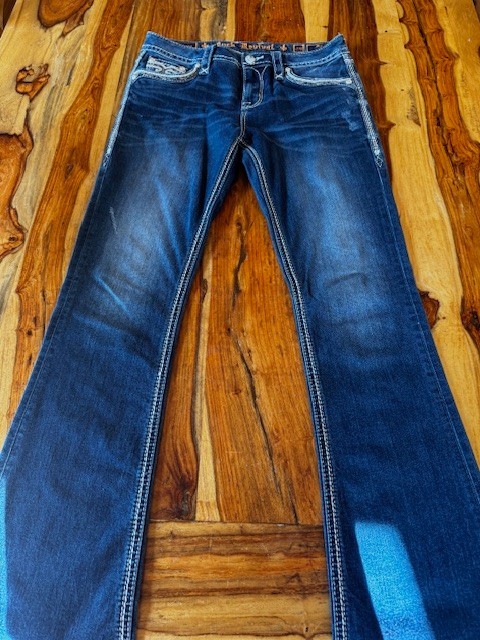 Authentic Rock Revival "Keeley" jeans in size 29, mid-rise bootcut style, 32 inch inseam. Features signature fleur-de-lis embroidery, silver-tone hardware, and bold pocket stitching. Designed in USA. Excellent condition with no stains, tears, fraying or flaws. Worn very little and kept in a smoke-free home. Embellished denim with a Western edge! Happy to provide additional measurements if needed.