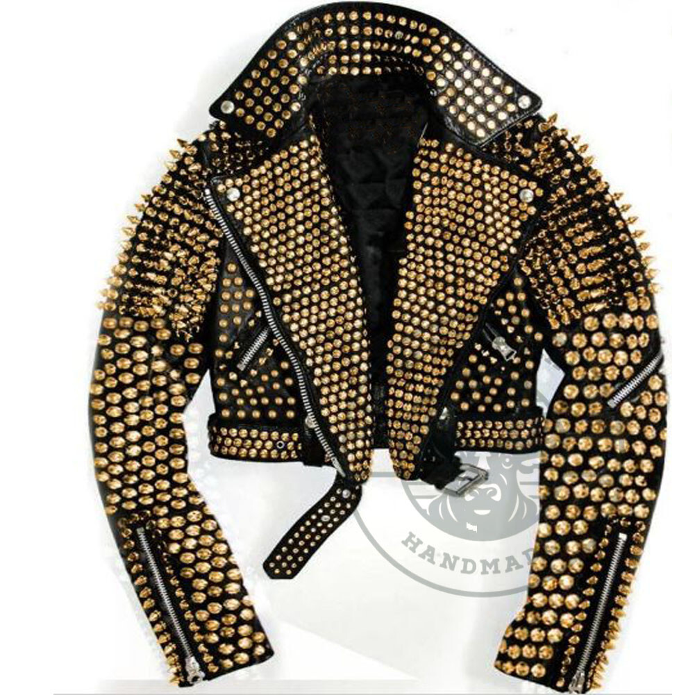 Rock & Roll Black Gold Studded Spiked Leather Biker Jacket Handmade