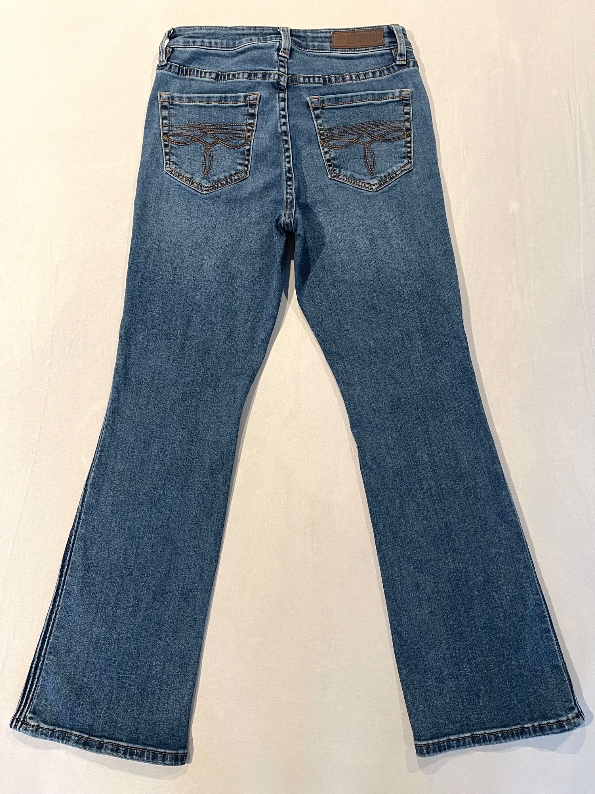 This is a pair of Rock & Roll Denim high rise bootcut stretch blue jeans for women in size 28 x 30. These jeans feature a solid pattern, zip and button closure, and a medium rinse fabric wash. Made of 6% polyester, 1% spandex, and 93% cotton denim, they have a high rise waist and a regular fit. The jeans also have contrast stitching, Rock & Roll button accents, and embroidered back pockets details, as well as a 5-pocket design and coin pocket. Perfect for all seasons and inspired by Western style, these jeans offer both style and comfort for any casual occasion.