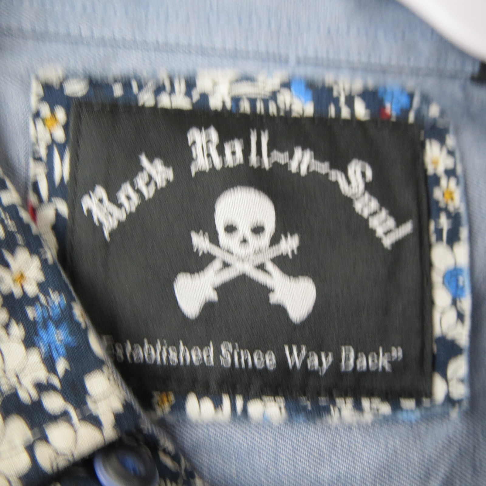 Rock Roll-n-Soul Men's L Large Blue Floral Skull Button Up Shirt Western Punk