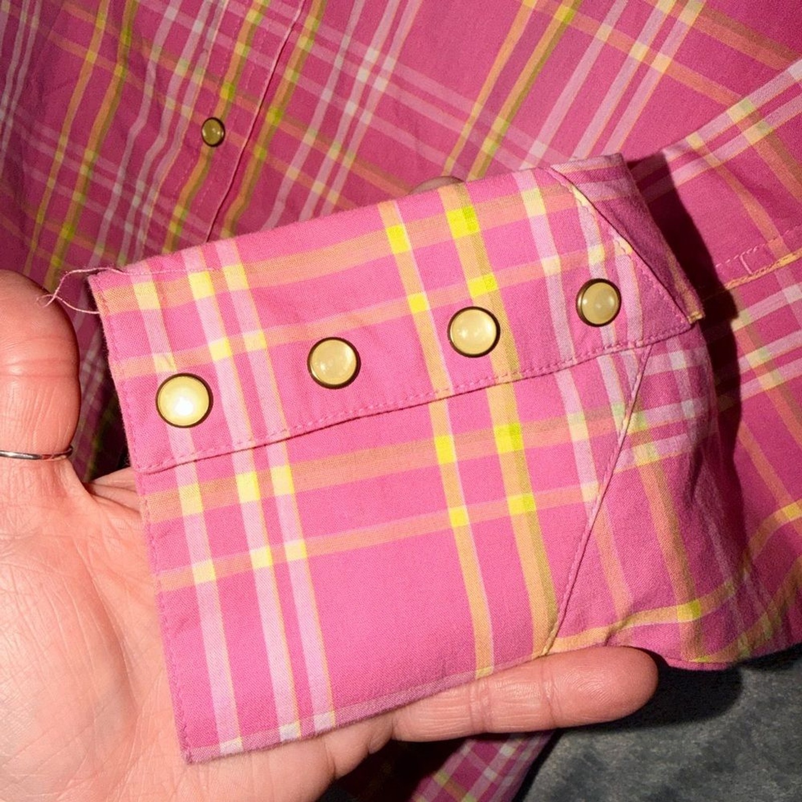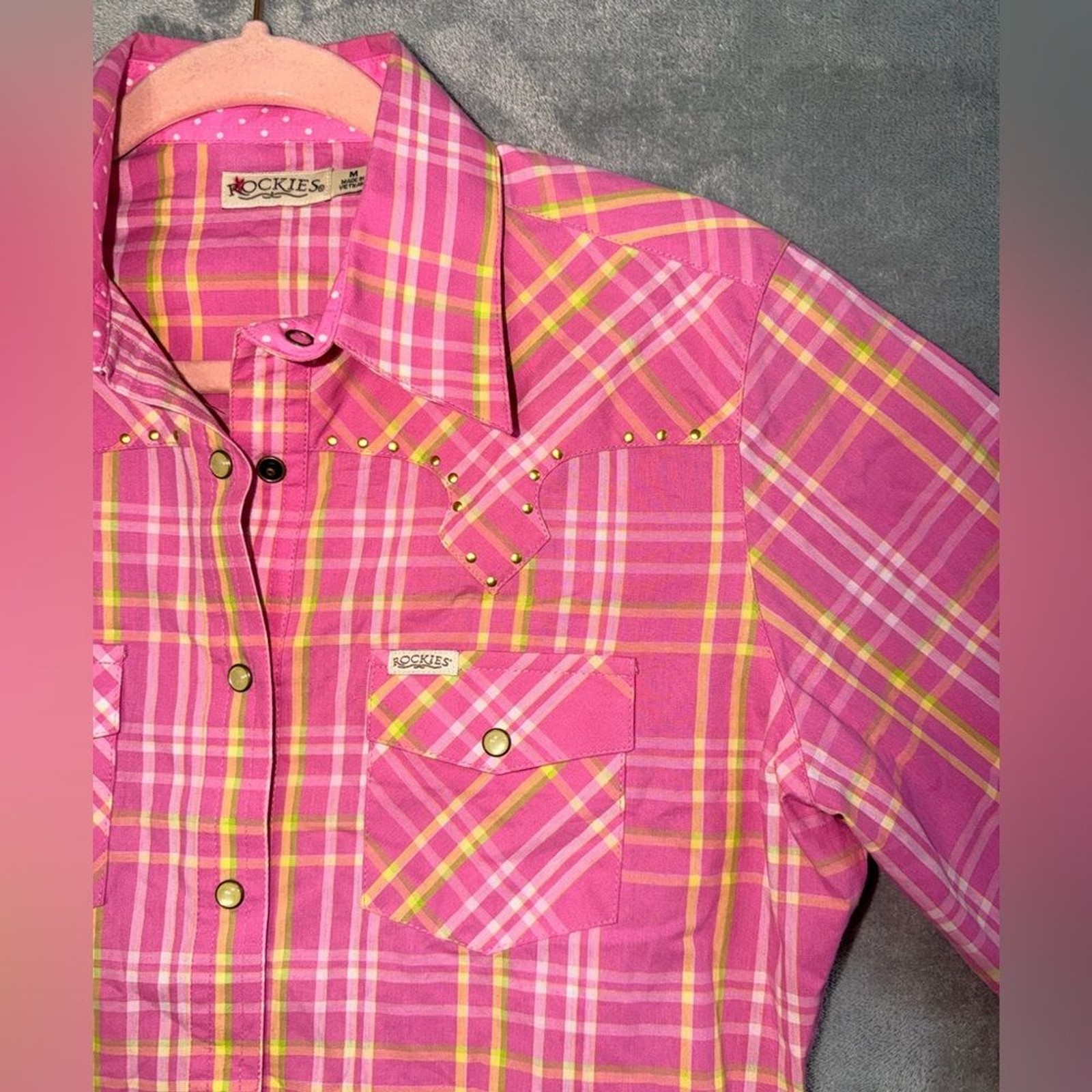 Rockies women’s pink plaid western shirt. Long sleeve, pearl snap, and snap cuff sleeves. Shirt is perfect for cowgirl style, rodeos, concerts, or casual wear. Size: Medium Great Condition. Comes from a pet-free and smoke-free home.