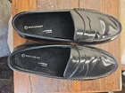 The Rockport's Adiprene Black Penny Loafers in Men's Size 9W are stylish dress shoes perfect for any formal occasion. Made with leather and featuring an almond toe shape, these slip-on loafers offer a comfortable and lightweight option for the modern man. With a cushioned insole and memory foam outsole, these shoes provide added comfort and support throughout the day. The black color and preppy theme make them versatile for wearing in the summer, fall, or spring seasons. Made in Vietnam, these loafers are a great addition to any man's shoe collection....B2371