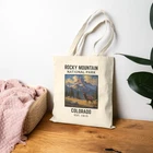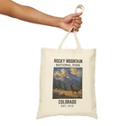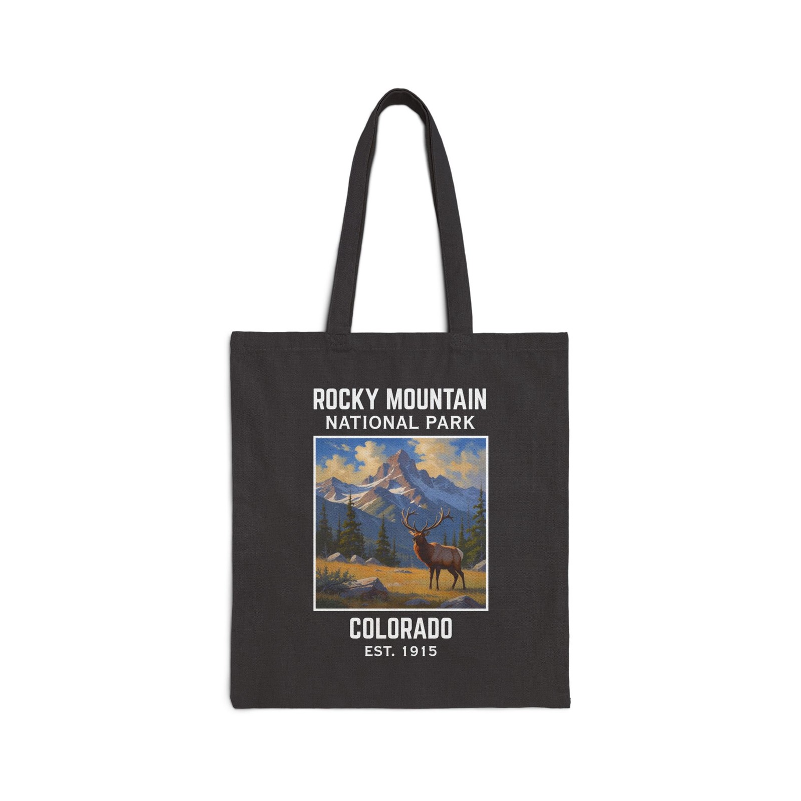 A sturdy and durable tote bag featuring a design of Rocky Mountain National Park Colorado with a graphic of the Rocky Mountains and an elk. Perfect for nature lovers and those who enjoy exploring national parks. Ideal for carrying groceries, books, and other essentials. Great for anyone who appreciates the beauty of the outdoors. Perfect for gifting on birthdays, holidays, and special occasions. Product features - 100% Cotton canvas - Flat corners for easy storage - Reinforced carrying handles - Heavy fabric for durability - Available in natural and black Care instructions - Do not iron directly over the printed area - print may stick to the iron. - Spot clean - Do not bleach - Line dry