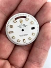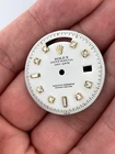 Rolex 1803 36mm Vintage White AM Diamond Day Date Dial Pan Pie Dial for used Presidential Used 1803 model Rolex Day Date 36mm Yellow Gold White Natural V.S Baguette Diamonds White Diamond Dial Pan Pie Non-Numeric Hour Marks After market Set Diamonds This vintage Rolex 1803 dial is a stunning addition to any watch collection. The white AM diamond day date dial pan pie presidential has been carefully crafted to ensure it is of the highest quality. The non-numeric hour marks add a touch of elegance to the dial, making it perfect for any formal occasion. The dial is compatible with the Rolex Day Date and is specifically designed for those who appreciate vintage watches. The brand, compatibility brand, type, color, and dial style are all listed in the item specifics. This dial is perfect for anyone looking to add a touch of sophistication to their watch collection.