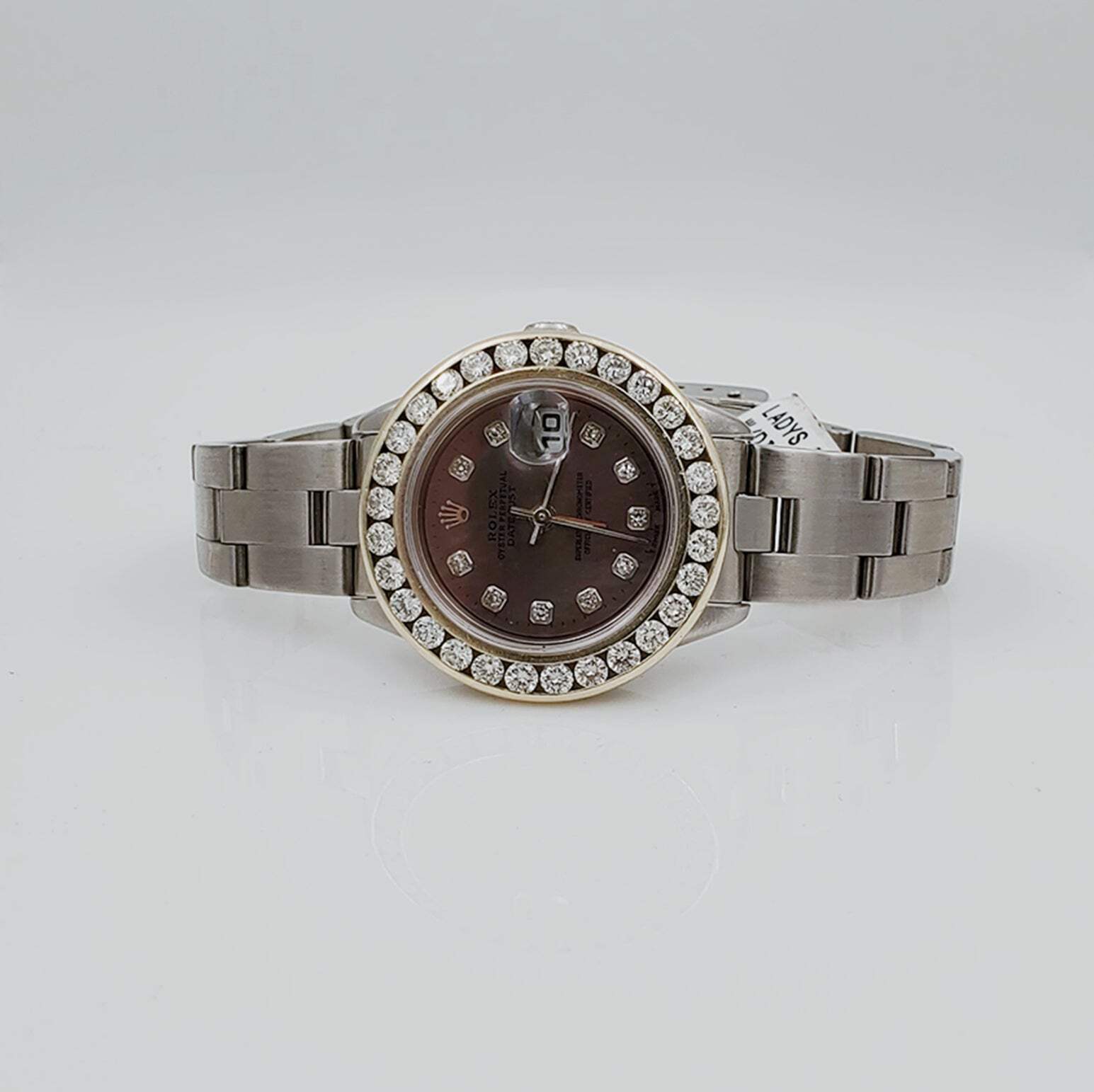 Rolex 26mm DateJust Steel Wristwatch with Black Diamond Dial & Diamond Bezel. Women's Rolex 26mm DateJust Stainless Steel Watch with Mother of Pearl Black Diamond Dial and Custom Diamond Bezel. Pre-Owned Brand: Rolex. Crystal: Sapphire. Gender: Women's. Dial: Diamond Dial. Bezel: Diamond Bezel. Movement: Self-Winding. Case Dimensions: 26mm. Metal Type: Stainless Steel. Dial Color: Mother of Pearl Black Dial. Bracelet: Oyster Bracelet / Stainless Steel. Box / Certificate: Rolex Box / Certificate of Authenticity. Service Warranty: One (1) Year Limited Service Warranty. NOTE: This beautiful Rolex watch includes an aftermarket custom diamond bezel. MONACO JEWELERS Women's Rolex 26mm DateJust Stainless Steel Watch with Mother of Pearl Black Diamond Dial and Custom Diamond Bezel. Pre-Owned Brand: Rolex. Crystal: Sapphire. Gender: Women's. Dial: Diamond Dial. Bezel : Diamond Bezel. Movement: Self-Winding. Case Dimensions: 26mm. Metal Type: Stainless Steel. Dial Color: Mother of Pearl Black Dial. Bracelet: Oyster Bracelet / Stainless Steel. Box / Certificate: Rolex Box / Certificate of Authenticity. Service Warranty: One (1) Year Limited Service Warranty. NOTE: This beautiful Rolex watch includes an aftermarket custom diamond bezel. × × × × × × × × × × × × × BUY IT NOW Shipping info Click the Shipping & Payments tab above the listing description for more info Click the Shipping & Payments tab above the listing description for more info! Additional delivery notes PICK UP OPTION Sorry, our items are NOT available for pick-up. PAYMENT Immediate payment is required upon selecting "Buy It Now" or upon checking out through the cart. We accept payment via U.S. PayPal accounts and all Major Credit Cards, Debit Cards & Google Pay. We are legally required to collect sales tax in those states and localities where we maintain a physical presence (nexus). The applicable amount of sales tax charged to an order will be calculated based on the shipment destination's state and local sales tax laws. Thank you for shopping with us on eBay! Additional Information No additional information at this time Ask seller a question You might also like Ladies Rolex 26mm Presidential 18K Gold Watch with Mother of Pearl Diamond Dial. Men's Rolex DateJust 36mm Two Tone 18k Gold / Steel Watch with Egg Shell Dial. Ladies ESQ Swiss Movado Venture Stainless Steel Watch with Black Diamond Dial. Ladies Coach 26mm Gold Plated Watch w/Genuine Black Leather Band & White Dial. Contact To contact our Customer Service Team, simply click the button here and our Customer Service team will be happy to assist. Ask seller a question © Monaco Jewelers Shipping & Payments Click the Shipping & Payments tab above the listing description for more info Payment Accepted Payment Methods Immediate payment is required upon selecting "Buy It Now" or upon checking out through the cart. We accept payment via U.S. PayPal accounts and all Major Credit Cards, Debit Cards & Google Pay. We are legally required to collect sales tax in those states and localities where we maintain a physical presence (nexus). The applicable amount of sales tax charged to an order will be calculated based on the shipment destination's state and local sales tax laws. Thank you for shopping with us on eBay! Returns Returns are accepted Items must be returned within 14 days of the auction ending Buyer will pay for return shipping. eBay integration by
