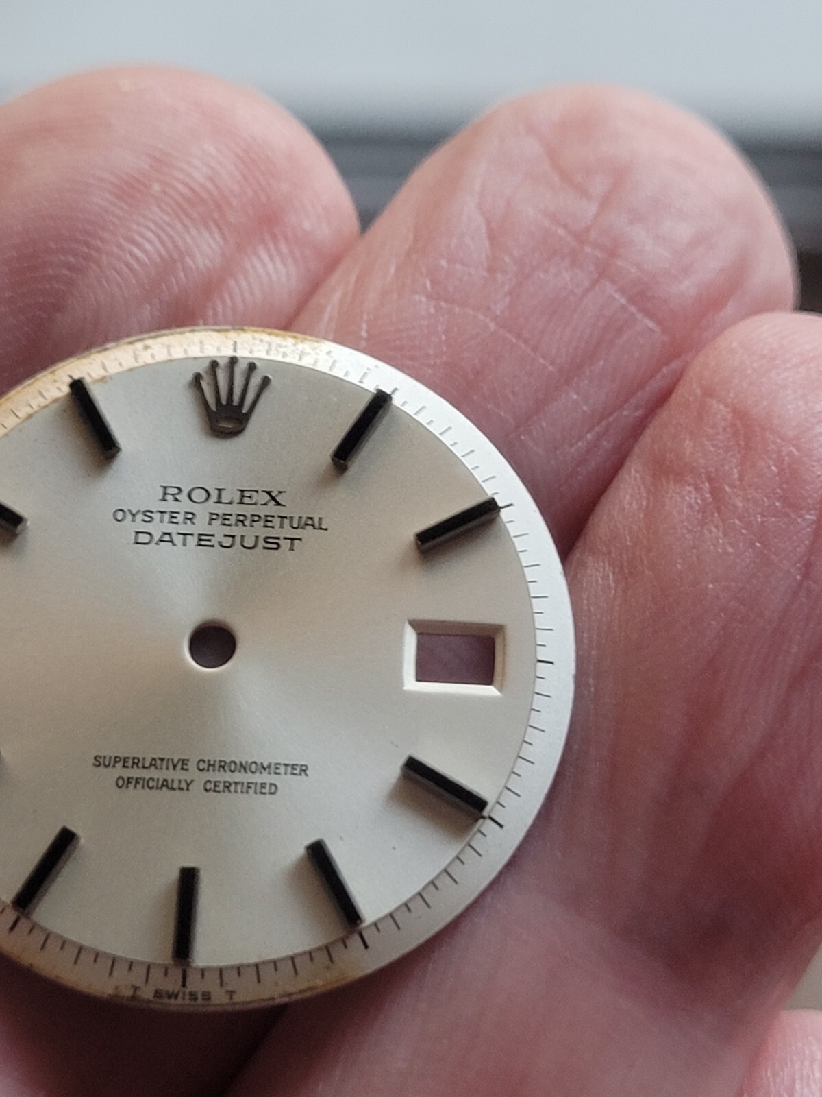 . Rolex 100 % genuine untouched Silver l With black lacquer marker top for 36 mm non quick set 1601/3 dial for all steel models in good vintage condition some as pictured