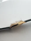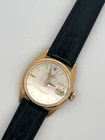 This Rolex Date wristwatch is a luxury timepiece with a yellow gold case and a smooth bezel. The watch features a sunburst dial pattern with arrow, baton, and dagger/dauphine indexes. It was manufactured between 1954-1957 and is vintage. The case is 34mm in size with a thickness of 10mm and a brushed finish. The watch has a buckle closure and a faux leather band with a width of 19mm. This Swiss-made watch has a mechanical (automatic) movement and a date indicator. Does not have papers or original box/packaging. The watch is unisex and has a style that is both classic and luxurious. It is a perfect addition to any watch collection and is sure to impress. Reference at 12 o'clock 6534 & serial numbers at 6 o'clock 408397. Comes with a black leather band & a gold plated buckle. Calendar date is alternating black & red. No work has been done, and is currently running and keeping time & date. Being sold AS IS & NO WARRANTY.